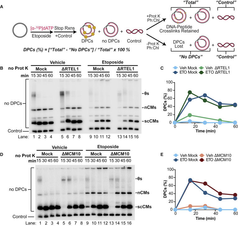 (A) Plasmid DNA was replicated in the presence or absence of etoposide (ETO). Samples were combined with a radiolabeled control plasmid, then split and treated with or without proteinase K (Prot K), and purified by phenol:chloroform extraction. Without Prot K treatment, only replication intermediates lacking DPCs (“No DPCs”) were recovered. With Prot K treatment, total replication intermediates were recovered (“Total”). Signal from replication intermediates was normalized to the loading control and then used to calculate the percentage of molecules containing DPCs at each time point, as indicated.