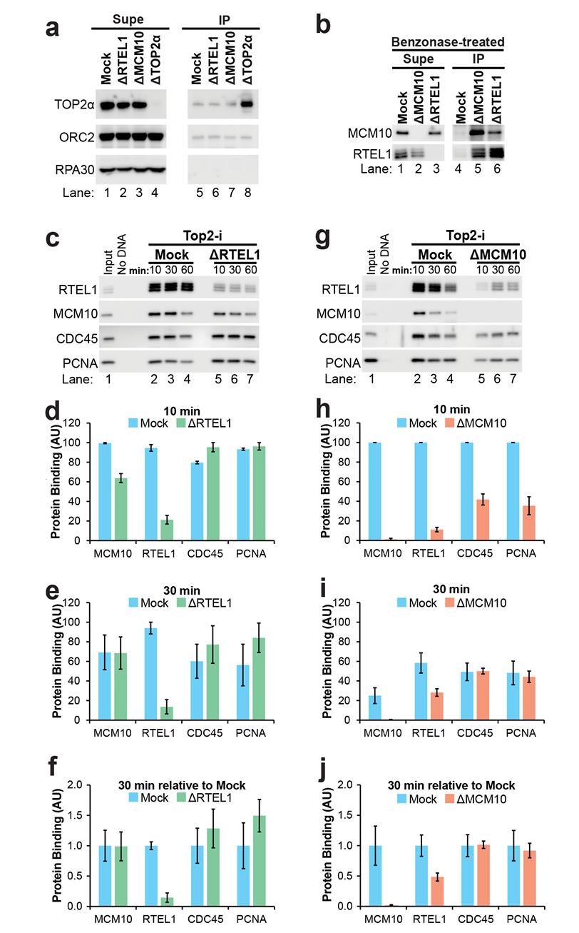 Supplemental Figure 5: Analysis of RTEL1 and MCM10 binding, related to Figure 3. (A) The immunoprecipitation shown in Figure 3D was repeated. The supernatant (Supe) and immunoprecipitate (IP) were then analyzed by Western blotting to detect TOP2α, RPA, and ORC. A representative experiment of two biological replicates is shown. (B) DNA-free Xenopus egg extracts were treated with Benzonase to ensure no residual DNA remained. Extracts were then mock treated (mock), depleted of RTEL1 (ΔRTEL1), or depleted of MCM10 (ΔMCM10) and the supernatant (Supe) and immunoprecipitate (IP) were analyzed by Western blotting. A representative experiment of two biological replicates is shown. (C) Plasmid DNA was replicated in the presence of Top2-i using mock- and RTEL1-depleted extracts. At the indicated time points DNA-bound proteins were recovered and analyzed by Western blotting. A representative experiment of three biological replicates is shown. (D) Quantification of protein binding from (C) at 10 minutes. Mean ± SEM, n=3 biological replicates. (E) Quantification of protein binding from (C) at 30 minutes. Mean ± SEM, n=3 biological replicates. Note that approximately 10-20% of RTEL1 binding persists even in RTEL1-depleted extracts, indicating incomplete immunodepletion. (F) An alternate representation of (E), where binding was normalized to the mock condition for each protein. Mean ± SEM, n=3 biological replicates. (G) Plasmid DNA was replicated in the presence of Top2-i using mock- and MCM10-depleted extracts. At the indicated time points DNA-bound proteins were recovered and analyzed by Western blotting. A representative experiment of three biological replicates shown. (H) Quantification of protein binding from (F) at 10 minutes. Mean ± SEM, n=3 biological replicates. (I) Quantification of protein binding from (F) at 30 minutes. Mean ± SEM, n=3 biological replicates. (J) An alternate representation of (I), where binding was normalized to the mock condition for each protein. Mean ± SEM, n=3 biological replicates.