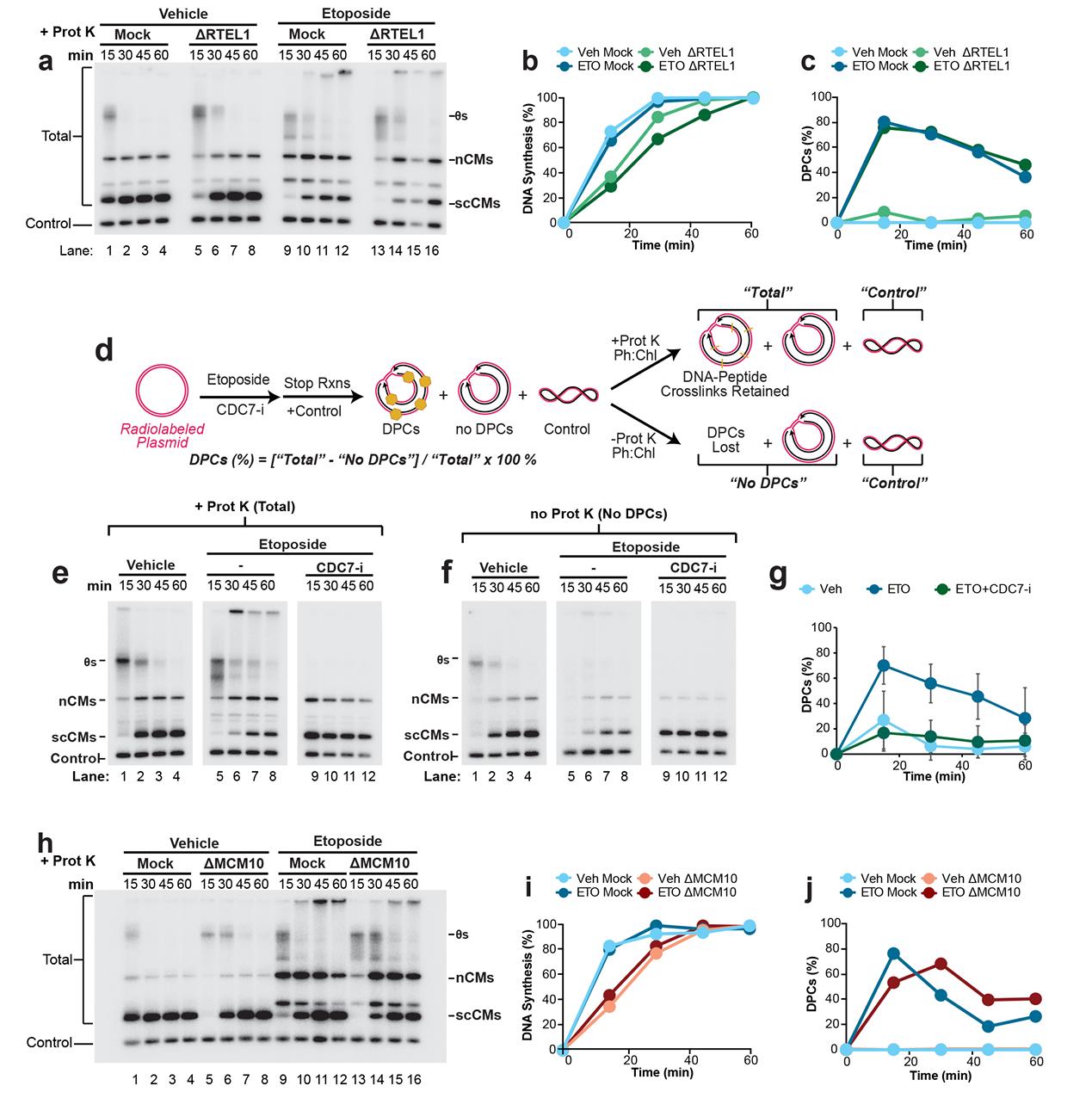 Supplemental Figure 6: Analysis of DNA-protein cross-link formation by etoposide, related to Figure 4. (A) Autoradiogram of proteinase K-treated samples corresponding to the untreated samples in Figure 4B. (B) Total DNA synthesis was measured from (A), normalized to the control. (C) A biological replicate of Figure 4C. (D) Plasmid DNA was radiolabeled and then replicated under unperturbed conditions (‘Vehicle’) or following etoposide treatment. To address the effect of DNA replication on etoposide-induced DPC formation, reactions were supplemented with CDC7 inhibitor (‘CDC7-i’) to block replication initiation [S10]. Samples were combined with a radiolabeled control plasmid (‘control) then treated with Proteinase K (Prot K) and purified by phenol:chloroform extraction, as in Figure 4. (E) Plasmid DNA from (D) was purified with Proteinase K treatment so that total DNA could be recovered. Samples were separated on a native agarose gel and visualized by autoradiography. θ structures correspond to plasmid DNA molecules undergoing DNA replication and were present in both the control and etoposide-treated conditions (lanes 1-8), indicating that DNA replication took place. θ structures were abolished by CDC7-i treatment, indicating that DNA replication was blocked under these conditions (lanes 9-12). (F) Plasmid DNA from (D) was purified without Proteinase K treatment so that only DNA devoid of DNA-Protein Crosslinks (DPC) was recovered. Following etoposide treatment, θs were no longer visible and signal at early time points was diminished (compare lanes 5-8 in (B) and (A)) indicating that most molecules contained DPCs. In the presence of vehicle or following co-addition of CDC7-i there was little effect on the DNA structures formed (compare lanes 1-4 and 9-12 in (F) and (E)) indicating that few DPCs were formed under these conditions. (G) Quantification of DPC-containing molecules from (E) and (F). Mean ± SD, n=3 biological replicates. Following etoposide treatment most DNA molecules contain DPCs but co-addition of both etoposide and CDC7-i results in no appreciable increase compared to the vehicle condition. Thus, most of the etoposide-induced DPCs are replication-dependent under these conditions. (H) Autoradiogram of proteinase Ktreated samples corresponding to the untreated samples in Figure 4D. (I) Total DNA synthesis was measured from (D), normalized to the control. (J) A biological replicate of Figure 4E.