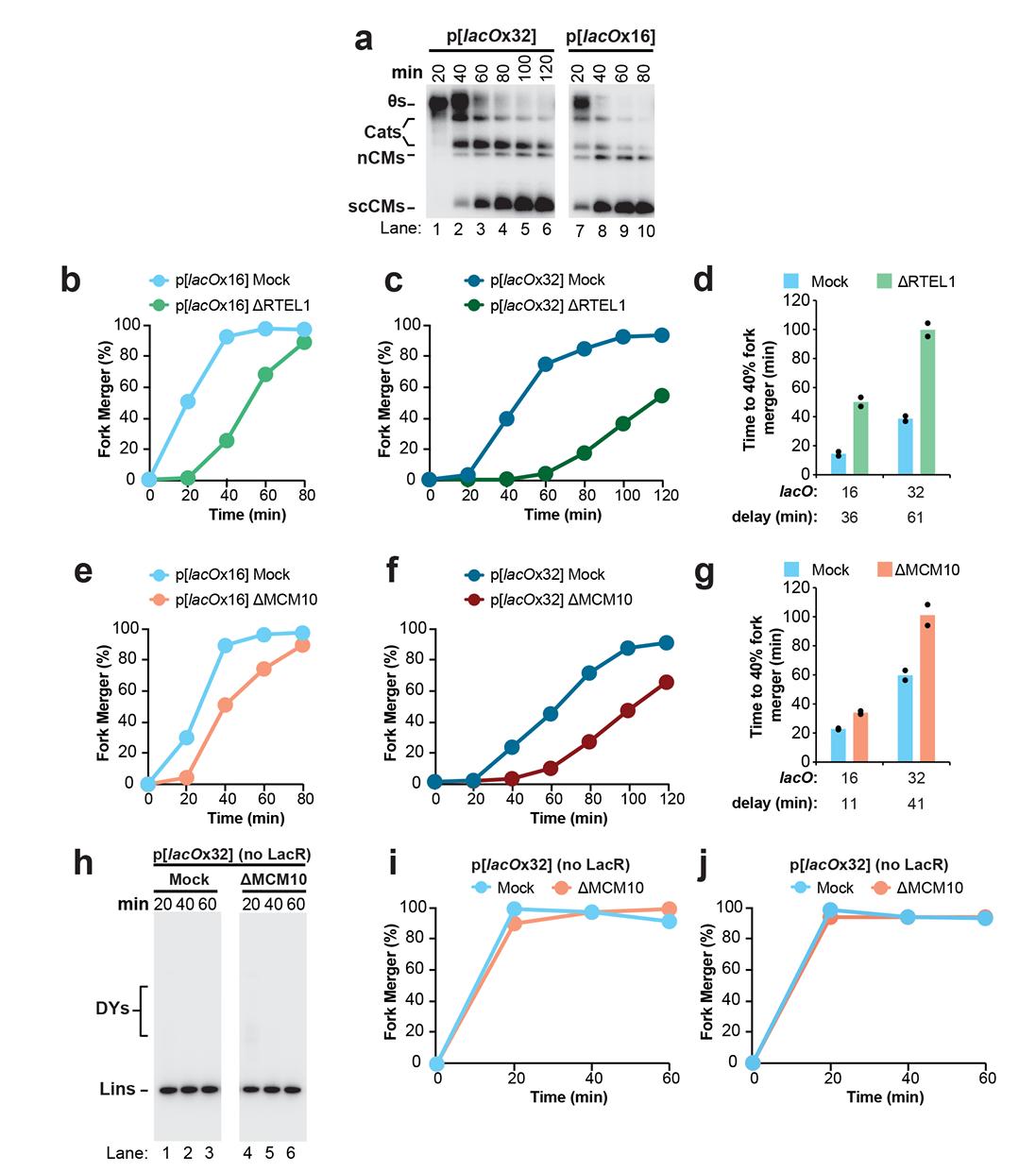 Supplemental Figure 7: Analysis of fork progression through a LacR barrier, related to Figure 5. (A) Replication was performed as in Figure 5A using mock-depleted extracts and replication intermediates were analyzed directly, without restriction digest. A representative experiment of two biological replicates is shown. Catenanes (Cats) were previously defined in [S1]. (B) A biological replicate of Figure 5C. (C) A biological replicate of Figure 5E, which is part of the same experiment shown in (A). (D) The time at which 40% of forks merged was calculated for Figure 5C,E and (B)-(C). Means were plotted (bars) alongside the individual values from two independent biological replicates (black circles). Mean values were used to calculate the delay in fork merger caused by RTEL1 depletion (ΔRTEL1) compared to the control (mock). (E) A biological replicate of Figure 5G. (F) A biological replicate of Figure 5I, which is part of the same experiment shown in (D). (G) The time at which 40% of forks merged was calculated for Figure 5G,I and (E)-(F) as in (D). Means were plotted (bars) alongside the individual values from two independent biological replicates (black circles). Mean values were used to calculate the delay in fork merger caused by MCM10 depletion (ΔMCM10) compared to the control (mock). (H) As part of the experiment shown in Figure 5F,H fork merger was monitored in mock and MCM10depleted extracts as in Figure 5A but in the absence of LacR. Samples were separated on a native agarose gel and visualized by autoradiography. (I) Fork merger was measured from (H). (J) A biological replicate of (I).