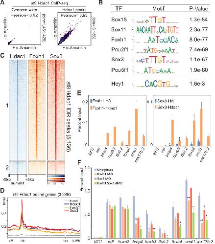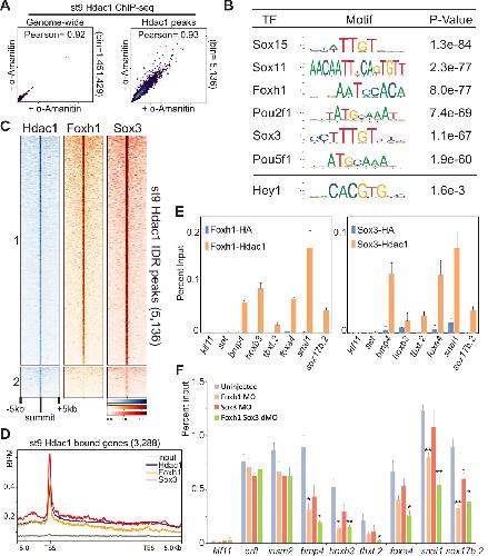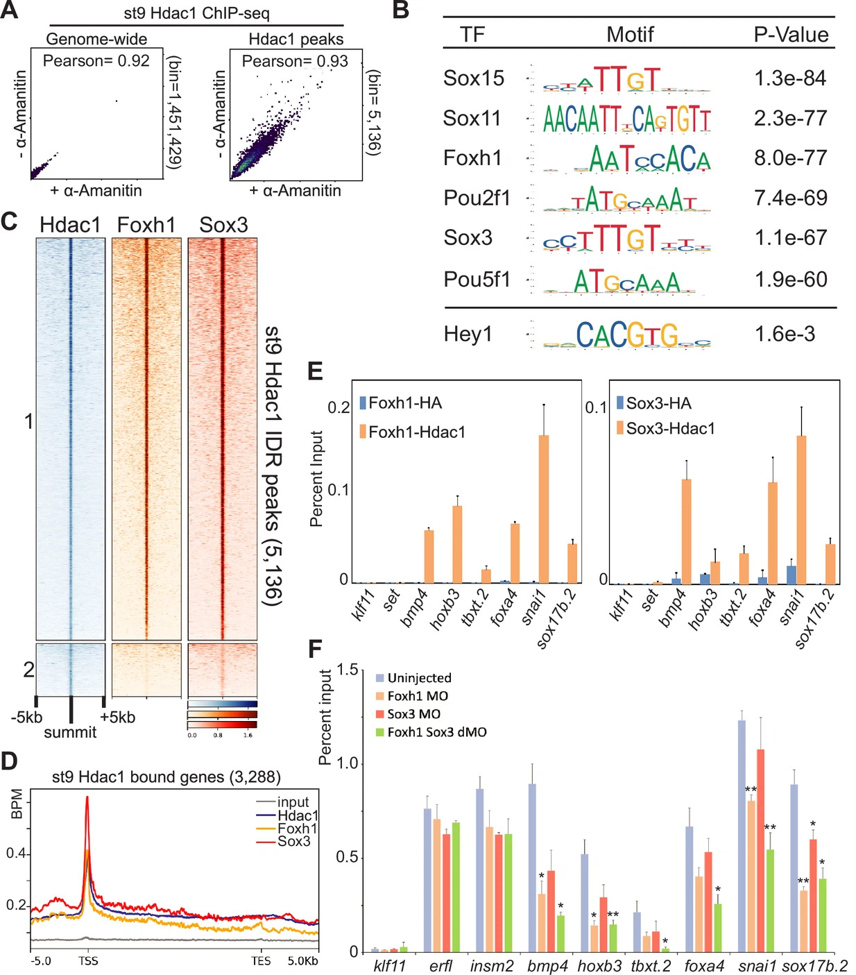 Figure 2. Maternal factors instruct Hdac1 recruitment during blastula stages.(A) Pairwise Pearson correlation analyses comparing ChIP-seq signals of st9 Hdac1 irreproducibility discovery rate (IDR) peaks between α-amanitin-injected and uninjected embryos across the genome (left) and among Hdac1 IDR peaks (right). (B) Motif analyses of st9 Hdac1 peaks (500 bp centered on IDR peak summit). Motif sequence to the corresponding factor is retrieved from JASPAR. Hey1 is an example of TF motif with low significance. (C) Clustered heatmap depicting st9 Foxh1 and Sox3 ChIP-seq signals in a window of 10 kb centered on st9 Hdac1 IDR peaks with descending order. (D) ChIP-seq signal enrichment of Hdac1, Foxh1, and Sox3 within the intervals of 5 kb upstream of gene model 5′ ends, gene bodies (normalized for length), and 5 kb downstream of gene model 3′ ends of st9 Hdac1 associated genes. The signal of st9 input DNA ChIP-seq is used as a negative control. Y-axis values represent reads quantified by bins per million (BPM) at a bin size of 50 bp. (E) St9 sequential ChIP-qPCR analyses for Foxh1 and Hdac1 co-bound regions and Sox3 and Hdac1 co-bound regions. anti-HA is used as a negative control. The error bars represent the variation from two technical replicates. (F) ChIP-qPCR analysis of Hdac1 peaks that are also Foxh1/Sox3 co-bound after Foxh1 and/or Sox3 depletion. Genomic loci associated with klf11 (no Hdac1 signals), erfl and insm2 (Hdac1 signals without Foxh1 or Sox3 signals) are negative controls. The error bars represent the variation from two technical replicates. Student’s t-test is used to calculate p-values over Hdac1 enrichment of uninjected embryos. * is for p< 0.05** is for p< 0.01.