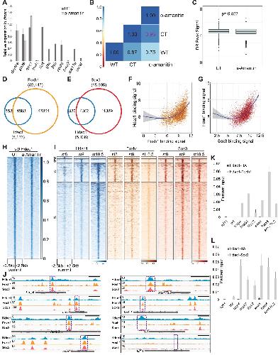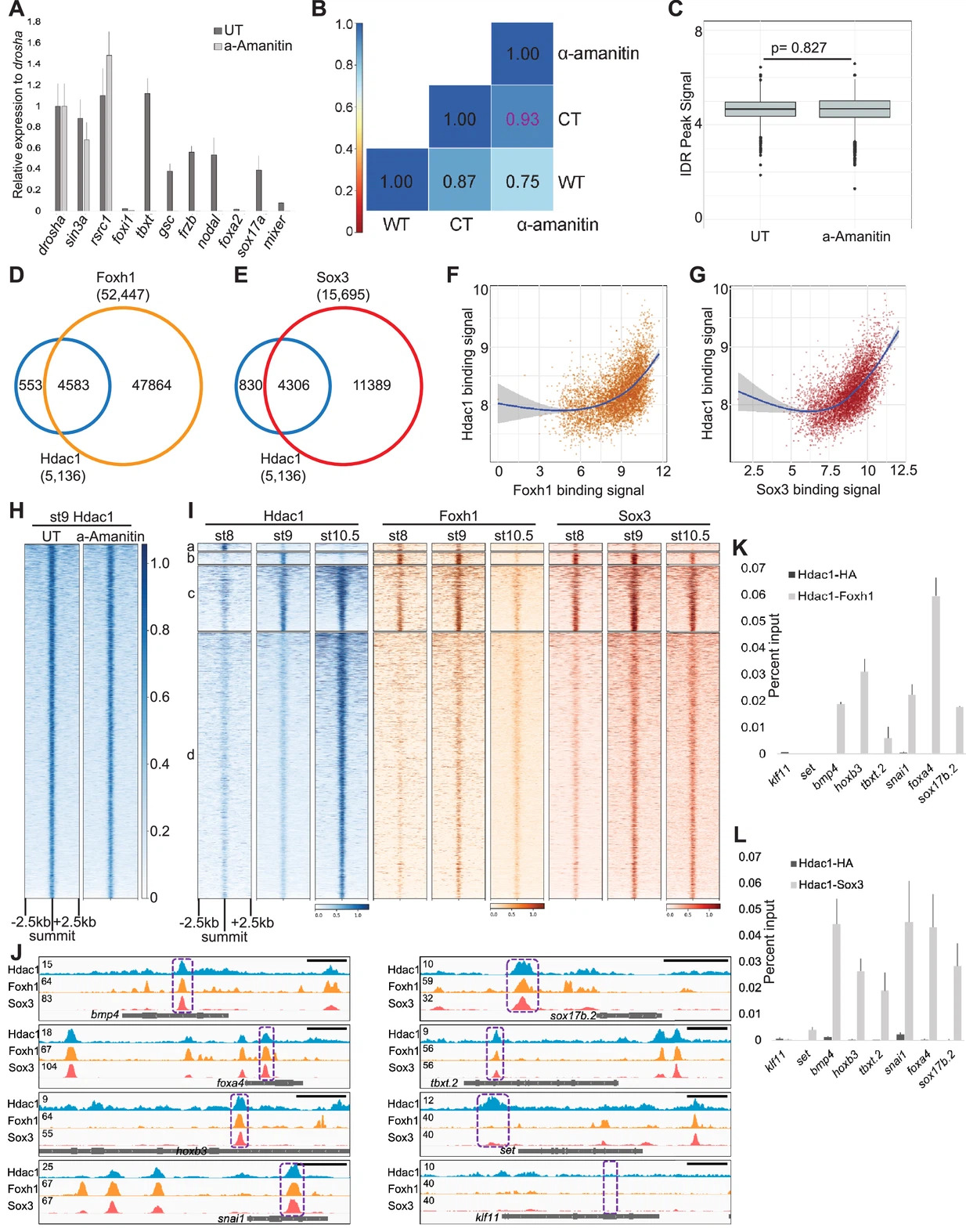 (A) Real-time quantitative PCR (RT-qPCR) analysis of maternal (maternal-zygotic) genes (drosha, sin3a, and rsrc1) and zygotic genes (foxi1, tbxt, gsc, frzb, nodal, foxa2, sox17a, and mixer). Note a high efficacy of α-amanitin blocking zygotic transcription. The error bars represent the variation from two technical replicates. (B) Pairwise Pearson correlation analyses comparing ChIP-seq signals of st9 Hdac1 irreproducibility discovery rate (IDR) peaks with controls. WT, CT, and α-amanitin denote wild-type samples from previous time-course experiments (Owens et al., 2016), α-amanitin-injected embryos, and stage (batch)-matched control embryos. (C) Box plot illustrating Hdac1 signal enrichment are unchanged between uninjected and α-amanitin-injected embryos at stage 9. Y-axis values represent log2(reads to IDR peaks/(peak size × read depth at IDR peaks) + 1). p-Value is calculated by two-tailed Student’s t-test. (D, E) Venn diagram showing the overlap between st9 IDR peaks of Foxh1 and Hdac1; Sox3 and Hdac1. (F, G) Scatter plots representing a positive correlation between binding signals of Foxh1 and Hdac1, and Sox3 and Hdac1. The binding signal is calculated as log2(reads mapped to st9 Hdac1 IDR peaks per kb + 1). Blue lines depict linear regression curves generated from a generalized additive model. Gray areas denote a 95% confidence interval. (H) Heatmap showing Hdac1 ChIP-seq signals between uninjected and α-amanitin-injected embryos in a window of 5 kb centered on st9 Hdac1 IDR peaks with descending order. (I) Clustered heatmaps depicting Foxh1 and Sox3 ChIP-seq signals on stage 8, 9, and 10.5 Hdac1 IDR peaks in a window of 5 kb centered on Hdac1 peaks. Each cluster corresponds to the same regions present in Figure 1C. (J) Genome browser visualization of Hdac1, Foxh1, and Sox3 signals on bmp4, foxa4, hoxb3, snai1, sox17b.2, tbxt.2, set, and klf11 genes. Purple boxes represent genomic regions examined in sequential ChIP-qPCR experiments. Y-axis values represent scaled track height. Black bars denote an interval of 2 kb. Reciprocal sequential ChIP-qPCR analyses representing Figure 2D, E assessing (K) Foxh1 and Hdac1 co-bound regions; (L) Sox3 and Hdac1 co-bound regions. anti-HA is used as a negative control. The error bars represent the variation from two technical replicates.