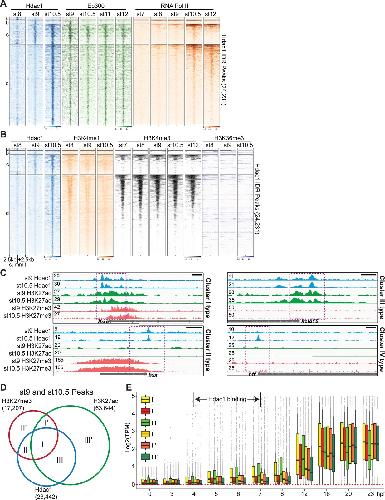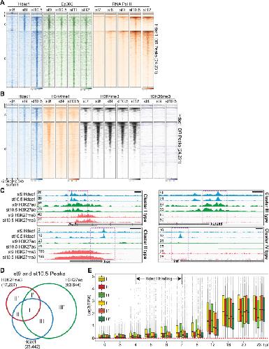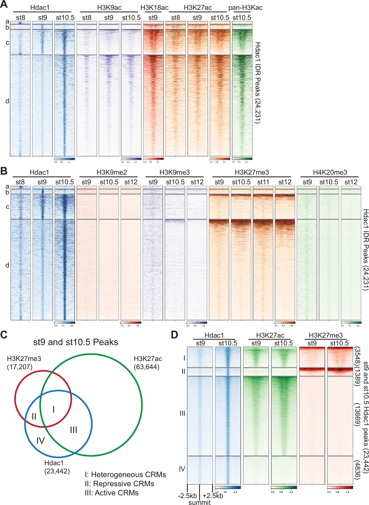 Figure 3. Hdac1 binds to cis-regulatory modules (CRMs) containing functionally distinct histone modifications.Clustered heatmaps showing signals from several stages of various (A) histone acetylation marks and (B) repressive histone methylation marks on Hdac1 peaks. Each cluster corresponds to the same regions present in Figure 1C. (C) Venn diagram illustrating Hdac1 peaks overlapping with H3K27me3 and H3K27ac peaks from both st9 and st10.5 combined. (D) Clustered heatmaps depicting signals of H3K27me3 and H3K27ac on combined st9 and st10.5 Hdac1 peaks. Clusters denote the same genomic regions in C. Numbers on the right side indicate the total number of regions in each cluster. The signals are shown in a window of 5 kb centered on the summits of Hdac1 peaks presented in descending order of track signal intensities within each cluster.