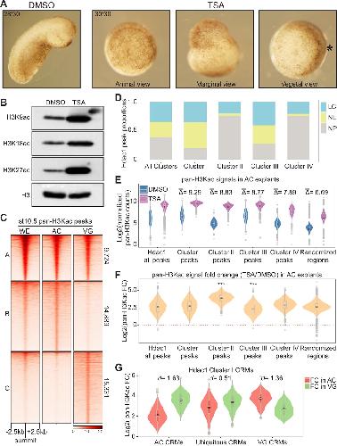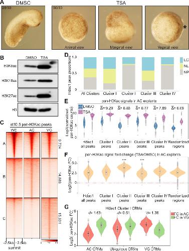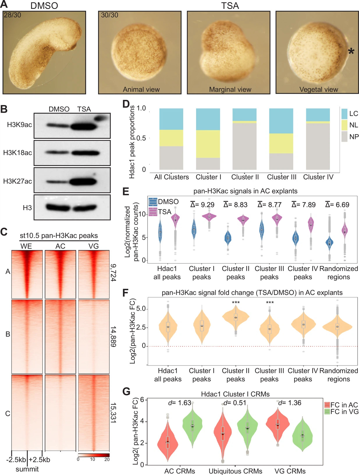 Figure 4. Hdac1 maintains differential H3 acetylomes between germ layers.(A) Embryos treated with 100 nM Trichostatin A (TSA) displaying gastrulation defects 24 hr post-fertilization. Asterisk denotes the dorsal side containing the early blastopore lip. (B) Western blot analyses showing various histone acetylation modifications affected by HDAC inhibition. Anti-H3 is used as a loading control. (C) Clustered heatmap depicting signals of pan-H3Kac at st10.5 in whole embryos (WE), animal cap (AC), and vegetal mass (VG) cells. The signals are shown in a window of 5 kb centered on the summits of combined AC and VG peaks presented in descending order within each cluster. (D) Stacked bar graph representing proportions of localized (LC) versus non-localized (NL) pan-H3Kac signals found at Hdac1 cis-regulatory module (CRM) clusters in Figure 3C. A Hdac1 peak is considered to exhibit localized pan-H3Kac if it overlaps with either AC- or VG-specific pan-H3Kac peaks (Cluster B or C in C); a Hdac1 peak is considered to exhibit non-localized pan-H3Kac if it overlaps with pan-H3Kac peaks shared between AC and VG (Cluster A in C). NP: not overlap with any pan-H3Kac peak. (E) Spike-in normalized pan-H3Kac signals across Hdac1 CRM clusters (clusters in Figure 3C) in Dimethy Sulfoxide (DMSO)- or TSA-treated AC explants. Δ¯ represents the log2 scaled average differences of spike-in normalized pan-H3Kac signals between DMSO- and TSA-treated AC explants. Randomized genomic regions (n = 23,442) are used as the negative control. (F) Fold changes (FC) of pan-H3Kac signals at Hdac1 CRM clusters (clusters in Figure 3C) in DMSO- or TSA-treated AC explants. Red dotted line denotes the level of zero. *** denotes p < 0.001 (Student’s t-test). (G) Fold changes (FC) of pan-H3Kac signals in Cluster I of Hdac1 CRM clusters (clusters in Figure 3C) for each spatial CRM category. d denotes effect size calculated by Cohen’s d.