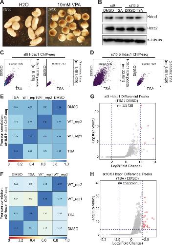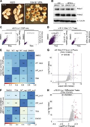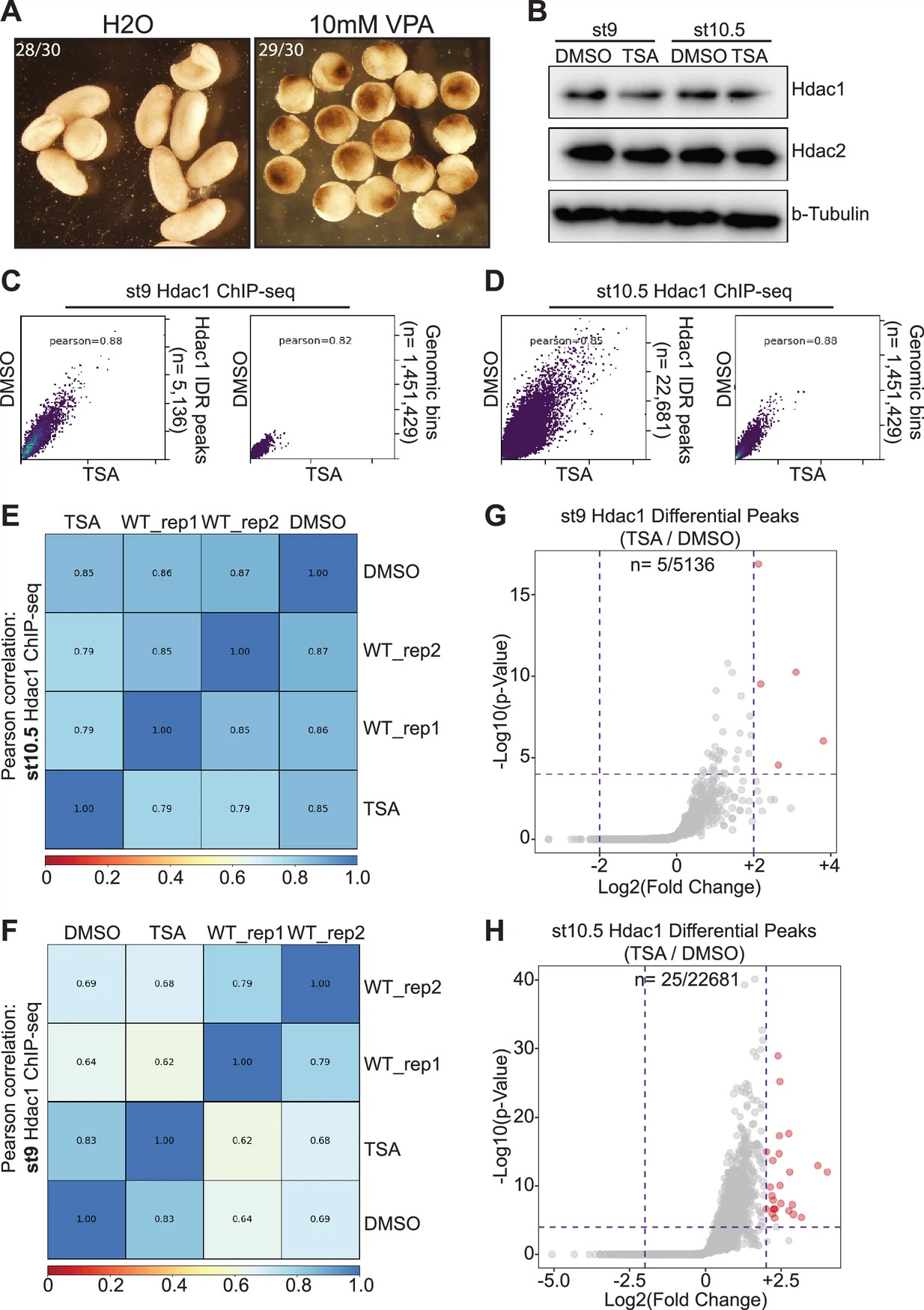 Figure 4—figure supplement 1. Trichostatin A (TSA)-mediated HDAC inhibition does not alter Hdac1 genomic occupancy.(A) Embryos treated with 10 mM valproic acid (VPA) display gastrulation defects at 24 hr post-fertilization. (B) Western blot analyses showing protein levels of Hdac1 and Hdac2 upon TSA treatment in st9 and st10.5 embryos. b-Tubulin is used as a loading control. (C, D) Pairwise Pearson correlation analyses comparing Hdac1 ChIP-seq signals of (C) st9 and (D) st10.5 DMSO- and TSA-treated embryos. (E, F) Pairwise Pearson correlation analyses comparing Hdac1 ChIP-seq signals of (E) st9 and (F) st10.5 DMSO- and TSA-treated embryos among different sample batches. WT denotes two biological replicate samples from time-course experiments. (G, H) Differential ChIP-seq analysis of (G) st9 and (H) st10.5 Hdac1 ChIP-seq between DMSO- and TSA-treated embryos. Red dots denote significant and gray dots denote nonsignificant differential irreproducibility discovery rate (IDR) peaks.