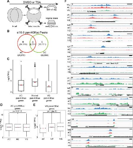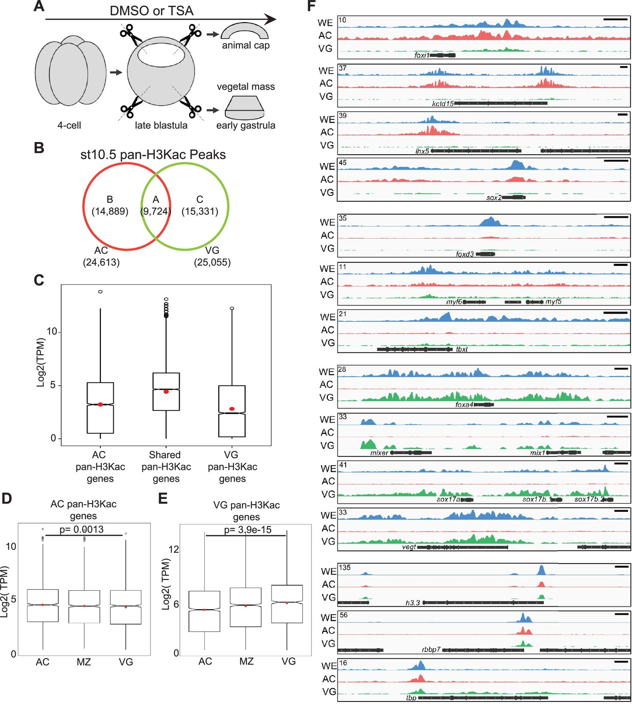 Figure 4—figure supplement 2. Differential H3 acetylomes are established in different germ layers.(A) A schematic diagram of dissection experiments to separate animal cap tissues (AC) and vegetal mass tissues (VG) for ChIP-seq or RNA-seq. Late blastula stage explants were cultured ~1–1.5 hr to the early gastrula stage before being harvested for analyses. (B) Venn diagram comparing pan-H3Kac peaks in AC and VG. (C) Transcripts per million (TPM) expression of genes associated with distinct spatial pan-H3Kac clusters in Figure 4C. (D, E) Transcripts per million (TPM) expression of genes associated with (D) AC-specific pan-H3Kac and (E) VG-specific pan-H3Kac peaks across three germ layers. p-Values are calculated by Student’s t-test. (F) Genome browser visualization of pan-H3Kac signals at known ectodermal (foxi1, kctd15, lhx5, sox2), mesodermal (foxd3, myf5, myf6, tbxt), endodermal (foxa4, mixer, mix1, sox17a, sox17b.1, sox17b.2, vegt), and ‘housekeeping’ (h3.3, rbbp7, tbp) genes in whole embryos, AC, and VG explants. Y-axis values represent scaled track height. Black bars denote an interval of 2 kb.