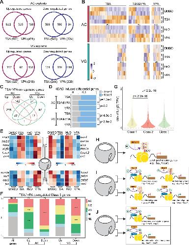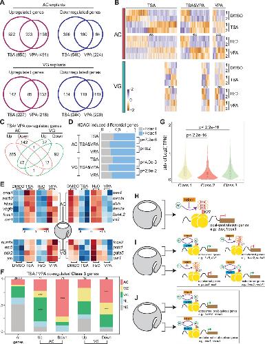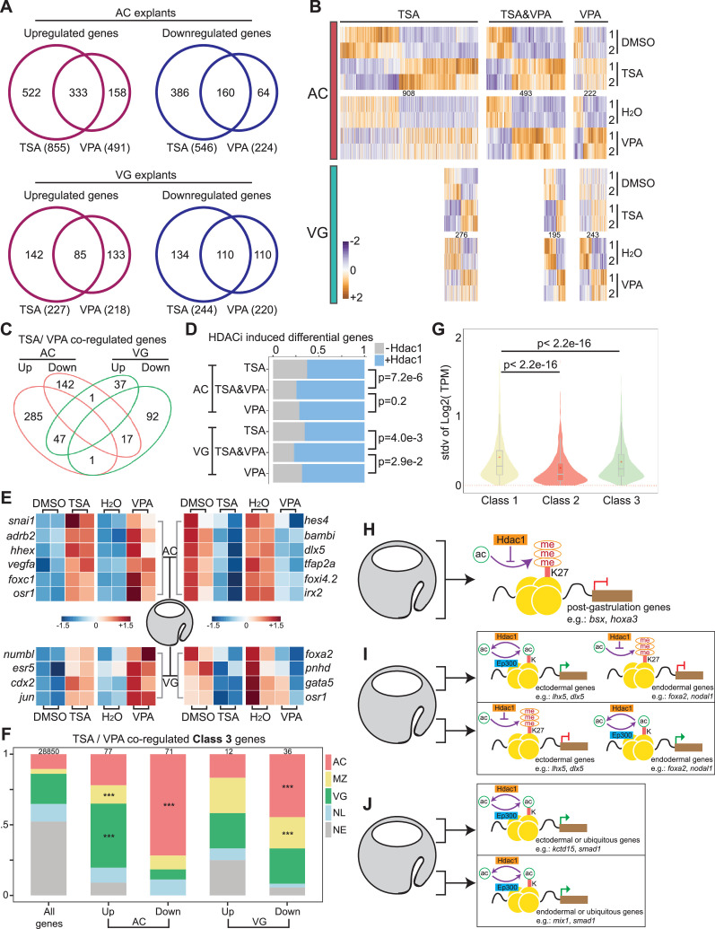 (A) Venn diagrams showing the overlap of differentially regulated genes by Trichostatin A (TSA) and valproic acid (VPA) treatment in AC or VG explants. (B) Differential expression profiles of genes induced by TSA alone, both TSA and VPA, and VPA alone in AC or VG explants. The total number of genes in each cluster is denoted. (C) Venn diagrams depicting the overlap of TSA/VPA co-regulated genes in AC and VG explants. (D) Proportions of Hdac1-bound and unbound genes differentially regulated by TSA alone, both TSA and VPA, and VPA alone in AC and VG explants. Fisher’s exact test is used to calculate the p-value. (E) Heatmaps depicting the expression levels of germ-layer genes (Supplementary file 3) co-regulated by TSA and VPA. (F) Spatial expression patterns of Class 3 genes co-regulated by TSA and VPA in proportions. The total number of genes in each category is listed at the top of each bar. Only *** denoting p < 0.001 (Fisher’s exact test) is shown. AC: animal cap, presumptive ectoderm; MZ: marginal zone, presumptive mesoderm; VG: vegetal mass, presumptive endoderm; NL: non-localized genes; NE: non-expressed genes. Parameters of spatial categories are detailed in Supplemental Methods. (G) The standard deviation of TPM values between five dissected tissue fragments for Class 1–3 genes. p-Values are calculated using Student’s t-test. (H–J) Models of Hdac1 function during germ-layer specification. (H) Hdac1 temporally suppresses the expression of genes expressed post-gastrulation. (I) Spatially Hdac1 safeguards misactivation of germ-layer genes in other germ layers suppressed by H3K27me3 or (J) devoid of histone acetylation; in addition, (I, J) Hdac1 sustains the activity of respective germ-layer genes.