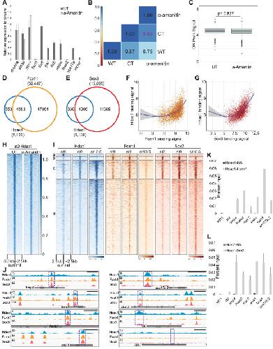 Figure 2—figure supplement 1. Hdac1 binding to genome is instructed maternally.(A) Real-time quantitative PCR (RT-qPCR) analysis of maternal (maternal-zygotic) genes (drosha, sin3a, and rsrc1) and zygotic genes (foxi1, tbxt, gsc, frzb, nodal, foxa2, sox17a, and mixer). Note a high efficacy of α-amanitin blocking zygotic transcription. The error bars represent the variation from two technical replicates. (B) Pairwise Pearson correlation analyses comparing ChIP-seq signals of st9 Hdac1 irreproducibility discovery rate (IDR) peaks with controls. WT, CT, and α-amanitin denote wild-type samples from previous time-course experiments (Owens et al., 2016), α-amanitin-injected embryos, and stage (batch)-matched control embryos. (C) Box plot illustrating Hdac1 signal enrichment are unchanged between uninjected and α-amanitin-injected embryos at stage 9. Y-axis values represent log2(reads to IDR peaks/(peak size × read depth at IDR peaks) + 1). p-Value is calculated by two-tailed Student’s t-test. (D, E) Venn diagram showing the overlap between st9 IDR peaks of Foxh1 and Hdac1; Sox3 and Hdac1. (F, G) Scatter plots representing a positive correlation between binding signals of Foxh1 and Hdac1, and Sox3 and Hdac1. The binding signal is calculated as log2(reads mapped to st9 Hdac1 IDR peaks per kb + 1). Blue lines depict linear regression curves generated from a generalized additive model. Gray areas denote a 95% confidence interval. (H) Heatmap showing Hdac1 ChIP-seq signals between uninjected and α-amanitin-injected embryos in a window of 5 kb centered on st9 Hdac1 IDR peaks with descending order. (I) Clustered heatmaps depicting Foxh1 and Sox3 ChIP-seq signals on stage 8, 9, and 10.5 Hdac1 IDR peaks in a window of 5 kb centered on Hdac1 peaks. Each cluster corresponds to the same regions present in Figure 1C. (J) Genome browser visualization of Hdac1, Foxh1, and Sox3 signals on bmp4, foxa4, hoxb3, snai1, sox17b.2, tbxt.2, set, and klf11 genes. Purple boxes represent genomic regions examined in sequential ChIP-qPCR experiments. Y-axis values represent scaled track height. Black bars denote an interval of 2 kb. Reciprocal sequential ChIP-qPCR analyses representing Figure 2D, E assessing (K) Foxh1 and Hdac1 co-bound regions; (L) Sox3 and Hdac1 co-bound regions. anti-HA is used as a negative control. The error bars represent the variation from two technical replicates.