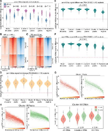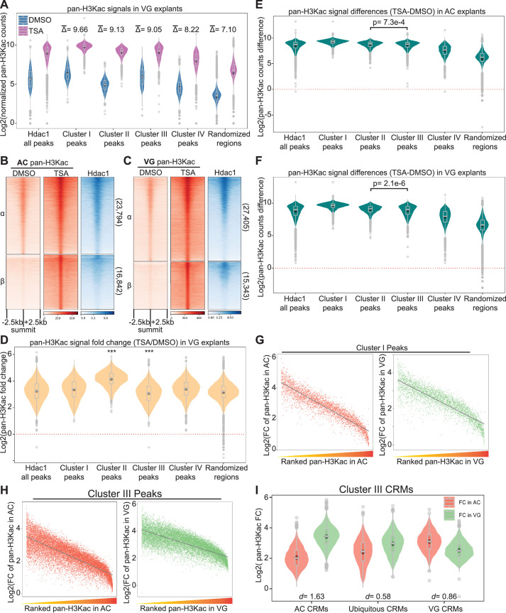 represents the log2 scaled average differences of spike-in normalized pan-H3Kac signals between DMSO- and TSA-treated VG explants. Randomized genomic regions (n = 23,442) are used as the negative control. (B, C) Clustered heatmaps depicting signals of pan-H3Kac and Hdac1 at st10.5 (B) animal cap (AC) and (C) VG explants treated with DMSO and TSA. The signals are scaled using spike-in normalization factors and shown in a window of 5 kb centered on the summits of pan-H3Kac peaks in descending order within each cluster. (D) Fold changes (FC) of pan-H3Kac signals at Hdac1 CRM Clusters (clusters in Figure 3C) in DMSO- or TSA-treated VG explants. Red dotted line denotes the level of zero. *** denotes p < 0.001 (Student’s t-test). (E, F) Pan-H3Kac signals at Hdac1 CRM Clusters (clusters in Figure 3C) in DMSO- or TSA-treated (E) AC and (F) VG explants. Values for Y-axis are log2 transformed. Red dotted line denotes the level of zero. Student’s t-test is used to obtain p-values. (G, H) Scatter plots representing the anti-correlation between fold changes of pan-H3Kac signals and ranked endogenous pan-H3Kac signals in Hdac1-bound CRM Cluster I and Cluster III of AC or VG explants shown in Figure 3C. Gray lines depict linear regression curves generated from a linear model. Both X and Y axes’ values are log2 transformed. (I) Fold changes (FC) of pan-H3Kac signals representing each spatial CRM category in Cluster III (clusters Figure 3C). d denotes effect size calculated by Cohen’s d.