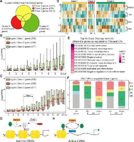Figure 5. Hdac1 regulates germ-layer transcriptomes both in time and space.Venn diagram comparing genes associated with Hdac1 cis-regulatory module (CRM) clusters (Clusters I–III in Figure 3C). Class 1 genes include genes closest to Cluster I peaks and genes overlapped in Classes 2 and 3; Class 2 are unique genes closest to Cluster II peaks; Class 3 are unique genes closest to Cluster III peaks. (B) Time-course TPM expression of zygotic genes in Classes 1–3 from fertilization to 10 hr post-fertilization (hpf, late st12.5). Red dotted line denotes zero. Bold number ‘4’ in red denotes the onset of zygotic genome activation (ZGA). (C) Time-course TPM expression of zygotic genes in Classes 1–3 up to 23 hpf (tailbud st26). Black vertical dotted lines denote the time window when Hdac1 binding is examined. Trend lines for each class are generated by connecting mean TPM values at each time point. (D) The expression profiles of genes affected by Trichostatin A (TSA) or valproic acid (VPA) in each class. The total number of genes in each heatmap cluster is denoted. (E) Gene ontology enrichment analysis of genes co-regulated by TSA- and VPA-mediated HDAC inhibition. Only genes with matched gene synonym to Homo sapiens are used in the analysis. (F) Spatial expression pattern of Class 1 genes co-regulated by TSA and VPA in proportions. The total number of genes in each category is listed at the top of each bar. Only *** denoting p < 0.001 (Fisher’s exact test) is shown. AC: animal cap, presumptive ectoderm; MZ: marginal zone, presumptive mesoderm; VG: vegetal mass, presumptive endoderm; NL: non-localized genes; NE: non-expressed genes. (G, H) Models of Hdac1 functioning at both inactive and active CRMs: (G) on inactive CRMs, H3K27 residue is maintained as unmodified by Hdac1, which may be subjected to H3K27me3-mediated suppression; (H) on active CRMs, the state of histone acetylation is dynamically modulated by Ep300- and-Hdac1-mediated acetylation–deacetylation cycles.