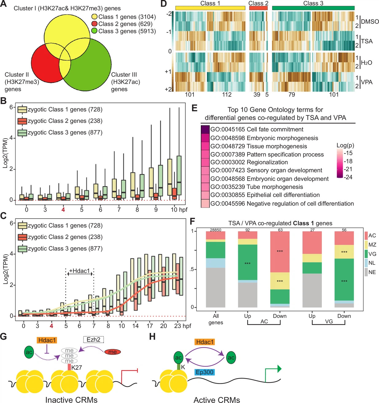 Venn diagram comparing genes associated with Hdac1 cis-regulatory module (CRM) clusters (Clusters I–III in Figure 3C). Class 1 genes include genes closest to Cluster I peaks and genes overlapped in Classes 2 and 3; Class 2 are unique genes closest to Cluster II peaks; Class 3 are unique genes closest to Cluster III peaks. (B) Time-course TPM expression of zygotic genes in Classes 1–3 from fertilization to 10 hr post-fertilization (hpf, late st12.5). Red dotted line denotes zero. Bold number ‘4’ in red denotes the onset of zygotic genome activation (ZGA). (C) Time-course TPM expression of zygotic genes in Classes 1–3 up to 23 hpf (tailbud st26). Black vertical dotted lines denote the time window when Hdac1 binding is examined. Trend lines for each class are generated by connecting mean TPM values at each time point. (D) The expression profiles of genes affected by Trichostatin A (TSA) or valproic acid (VPA) in each class. The total number of genes in each heatmap cluster is denoted. (E) Gene ontology enrichment analysis of genes co-regulated by TSA- and VPA-mediated HDAC inhibition. Only genes with matched gene synonym to Homo sapiens are used in the analysis. (F) Spatial expression pattern of Class 1 genes co-regulated by TSA and VPA in proportions. The total number of genes in each category is listed at the top of each bar. Only *** denoting p < 0.001 (Fisher’s exact test) is shown. AC: animal cap, presumptive ectoderm; MZ: marginal zone, presumptive mesoderm; VG: vegetal mass, presumptive endoderm; NL: non-localized genes; NE: non-expressed genes. (G, H) Models of Hdac1 functioning at both inactive and active CRMs: (G) on inactive CRMs, H3K27 residue is maintained as unmodified by Hdac1, which may be subjected to H3K27me3-mediated suppression; (H) on active CRMs, the state of histone acetylation is dynamically modulated by Ep300- and-Hdac1-mediated acetylation–deacetylation cycles.