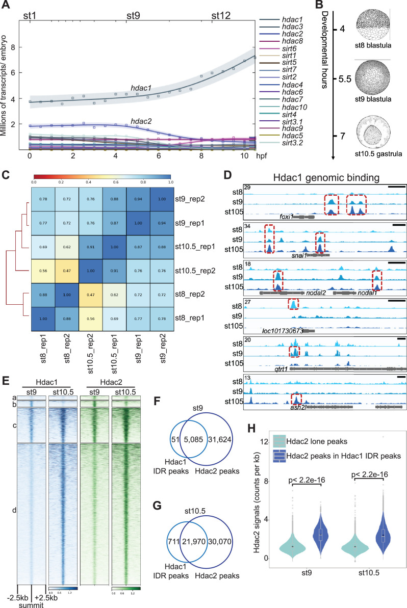 Figure 1—figure supplement 1. Hdac1 genomic occupancy in early Xenopus development.(A) Time-course expression levels of HDACs revealed by ribo-depleted RNA-seq (rdRNA-seq) in Xenopus tropicalis. (B) Graphic illustration of examined stages during early Xenopus development: st8 mid-blastula, st9 late blastula, and st10.5 early gastrula (Nieuwkoop and Faber, 1994). (C) Pearson correlation analyses of intra- and inter-stage Hdac1 ChIP-seq samples. (D) Genome browser visualization of Hdac1peaks on foxi1, snai1, nodal1, nodal2, loc101730673, qtrt1, and ash2l. Red boxes represent irreproducibility discovery rate (IDR) peaks passing IDR threshold (see Materials and methods) on listed genes (not all IDR peaks are boxed). Y-axis values represent scaled track height. Black bars denote an interval of 2 kb. (E) Clustered Hdac1 heatmap (left panel) over a window of 5 kb centered on the summit of all Hdac1 IDR peaks in descending order. Hdac2 ChIP-seq signals present around Hdac1 IDR peaks (right panel). Venn diagrams comparing Hdac1 IDR peak and Hdac2 peak (non-IDR) overlaps at st9 (F) and st10.5 (G). (H) Violin plot showing intensity differences of Hdac2 signals between Hdac2–Hdac1 overlapped peaks versus Hdac2 lone peaks at stages 9 and 10.5. Student’s t-test is used to calculate p-values.