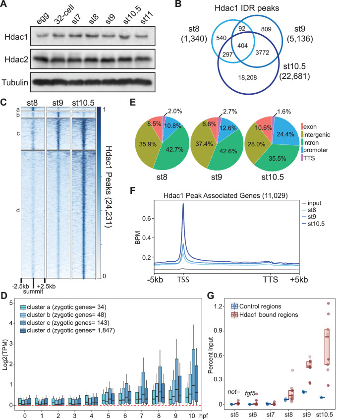 (A) Western blot analyses showing Hdac1 and Hdac2 proteins over a time course of early development. β-Tubulin is used as a loading control. (B) Venn diagram comparing Hdac1 irreproducibility discovery rate (IDR) peaks among examined stages. The sums of peaks in st8 and st9 are smaller due to instances where more than one peak from st8 or st9 overlaps the same single st10.5 peak. (C) Clustered heatmap showing Hdac1 ChIP-seq signals at each stage over a window of 5 kb centered on the summit of all Hdac1 IDR peaks in descending order. (D) The expression levels (TPM, transcripts per million) of genes associated with Hdac1 clusters at different developmental periods. (E) Distributions of Hdac1 IDR peaks at each stage across five defined genomic features. The promoter is defined as −1 kb to +100 bp from TSS (transcription start site) while the TTS (transcription termination site) is defined as −100 bp to +1 kb from TTS. (F) Distributions of Hdac1 ChIP-seq signals within the intervals of 5 kb upstream of gene model 5′ ends, gene bodies (normalized for length), and 5 kb downstream of gene model 3′ ends at each stage. The signal of st9 input DNA ChIP-seq is used as a negative control. Y-axis values represent reads quantified by bins per million (BPM) at a bin size of 50 bp. (G) ChIP-qPCR showing Hdac1 enrichment on selected genomic regions (nine positive regions: alkbh2, fgf5, foxi4.2, gdnf, hhex, miR428a, not, snai1, and sp8; two negative regions: hspa4 and klf11) at indicated stages of early embryogenesis.