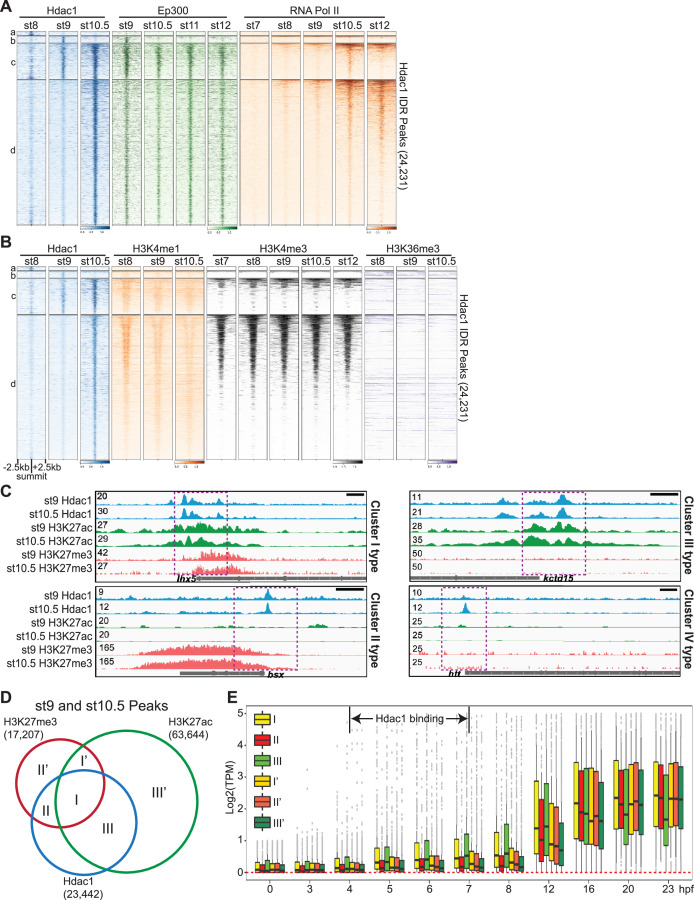 Figure 3—figure supplement 1. Hdac1-bound cis-regulatory modules (CRMs) are marked with distinct epigenetic signatures.Clustered heatmaps showing signals across several stages of (A) Ep300, RNA polymerase II, and (B) various active histone methylation marks on Hdac1 peaks. The signals are shown in a window of 5 kb centered on the summits of Hdac1 peaks. The signal density within each cluster is ordered by RNA polymerase II in (A) and by all samples in (B) by descending order. Each cluster corresponds to the same region in Figure 1C. (C) Genome browser visualization of Hdac1, H3K27ac, and H3K27me3 signals on genes representing Hdac1 CRM Clusters: Cluster I (lhx5), Cluster II (bsx), Cluster III (kctd15), and Cluster IV (htt). Y-axis values represent scaled track height. Black bars denote an interval of 2 kb. (D) Venn diagram showing Hdac1 peaks overlapping with H3K27me3 and H3K27ac peaks from both st9 and st10.5 combined. Additional clusters (I’, II’, and III’) represent genomic regions with the same H3K27 modifications to clusters (I, II, and III) but lack Hdac1 binding. (E) The expression levels of genes associated with six clusters in Figure 3D from 0 hr post-fertilization (egg) to 23 hpf (st26, tailbud).