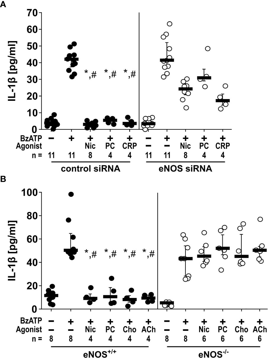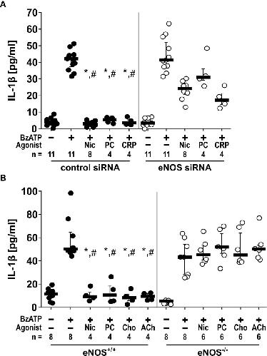 Figure 3 The inhibitory potential of cholinergic agonists on BzATP-induced IL-1β release by monocytic cells depends on endothelial nitric oxide synthase (eNOS, NOS3) activity. (A) U937 cells were transfected with siRNA targeting eNOS or with control siRNA. Forty-eight hours after transfection, cells were primed with lipopolysaccharide (LPS; 1 µg/ml) for 5 h and BzATP ((2’/3’-O-(4-benzoylbenzoyl)adenosine-5’-triphosphate, tri(triethylammonium) salt; 100 µM) was given for additional 30 min in the presence or absence of nicotinic agonists nicotine (Nic; 100 µM), phosphocholine (PC; 100 µM) or C-reactive protein (CRP; 5 µg/ml). While in cells transfected with control siRNA, the BzATP-induced release of IL-1 β was inhibited by nicotinic agonists, the inhibitory activity of all agonists was blunted in eNOS siRNA-transfected cells. Data were analyzed by Kruskal-Wallis test followed by Mann-Whitney rank sum test. (B) Freshly isolated mouse peripheral blood mononuclear cells (PBMCs) isolated from wild-type (eNOS+/+) mice and mice deficient in eNOS (eNOS-/-) were left untreated or stimulated with BzATP for 30 min, in the presence or absence of nicotinic agonists Nic, PC, choline (Cho; 100 µM) or acetylcholine (ACh; 10 µM). BzATP induced the release of IL-1β in PBMCs obtained from all mouse strains. Nicotinic agonists significantly inhibited the IL-1β release by PBMCs from eNOS+/+ mice. In contrast, the IL-1β release by PBMCs from eNOS-/- mice was not affected by nicotinic agonists. Friedman test followed by the Wilcoxon signed-rank test. Data are presented as individual data points, bars represent median, whiskers percentiles 25 and 75. ∗p ≤ 0.05 significantly different from samples, in which BzATP was given alone #p ≤ 0.05 significantly different from corresponding samples control siRNA vs. eNOS siRNA and eNOS+/+ vs. eNOS-/-.