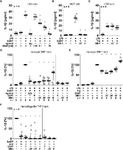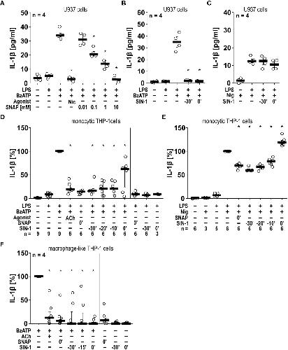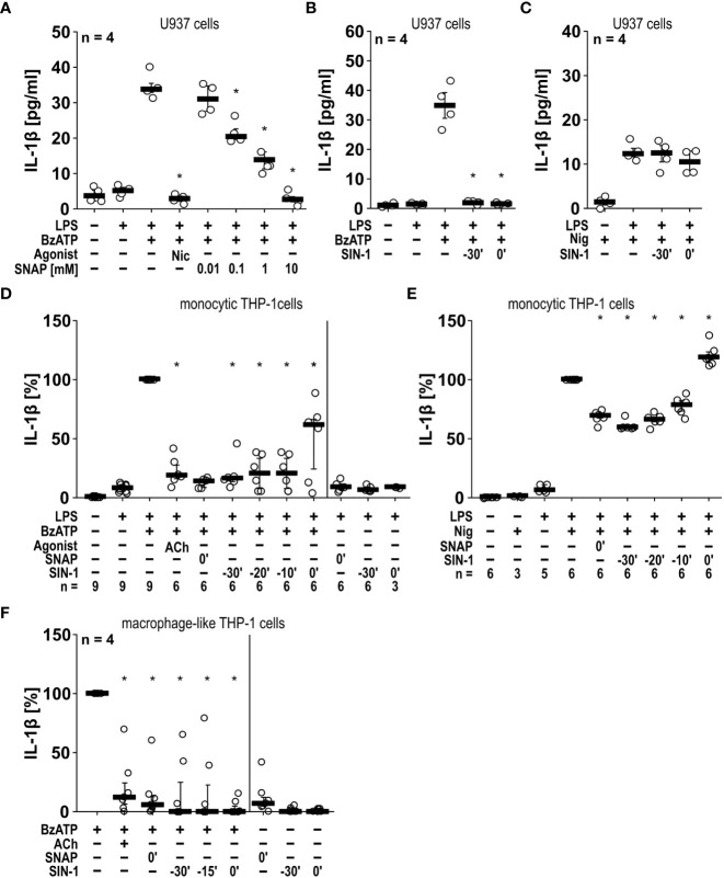 Figure 4 The BzATP-induced release of IL-1β by monocytic and macrophage-like cells is inhibited by the NO donors SNAP and SIN-1. (A, B) Monocytic U937 cells were primed with lipopolysaccharide (LPS; 1 µg/ml) for 5 h, and BzATP ((2’/3’-O-(4-benzoylbenzoyl)adenosine-5’-triphosphate, tri(triethylammonium) salt; 100 µM) was added for another 30 min to trigger IL-1β release, which was measured by ELISA. The NO donor SNAP (S-nitroso-N-acetyl-DL-penicillamine) concentration-dependently inhibited the BzATP-induced release of IL-1β like nicotine (Nic; 100 µM), which served as a positive control (A). Addition of SIN-1 (1 mM) 30 min before BzATP (t = -30’) or shortly before BzATP (t = 0’) inhibited the BzATP-induced release of IL-1β (B). U937 cells were primed with LPS for 5 h, and nigericin (Nig) was added together with apyrase (0.5 U/ml) for another 30 min to trigger IL-1 β release. The Nig-induced IL-1β release was unimpaired by SIN-1 (C). Kruskal-Wallis followed by Mann-Whitney rank sum test (A–C). (D, E) Similar results were found on LPS-primed monocytic THP-1 cells stimulated with BzATP (D) or Nig (E) for 40 min in the presence and absence of SNAP and SIN-1. Acetylcholine (ACh; 10 µM) was used as a positive control. The IL-1β concentration in supernatants of primed THP-1 cells stimulated with BzATP or Nig alone was set to 100%, and all other values were calculated accordingly. Friedman test followed by the Wilcoxon signed-rank test. (F) Macrophage-like THP-1 cells were left untreated or primed with LPS (1 µg/ml, 5 h). Thereafter, BzATP (100 µM) was added for another 40 min to trigger IL-1β release. The amount of IL-1β released in response to BzATP was calculated by subtracting the IL-1β concentrations measured in supernatants of cells treated with LPS alone. In the presence of ACh (10 µM) the BzATP-induced release of IL-1β was blunted. Application of the NO donors SNAP or SIN-1 at different time points, reversed the BzATP-induced release of IL-1β. Friedman test followed by the Wilcoxon signed-rank test. (A–F) Data are presented as individual data points, bars represent median, whiskers percentiles 25 and 75. ∗ p ≤ 0.05 significantly different from samples, in which BzATP or Nig was given alone.