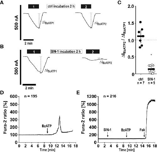 Figure 6. The NO and peroxynitrite donor SIN-1 inhibits BzATP-induced ion channel functions of heterologously expressed human P2X7 receptors (hP2X7R). (A–C) Two-electrode voltage-clamp measurements were performed on Xenopus laevis oocytes expressing the hP2X7R. (A) In control experiments (ctrl) application of the P2X7R agonist BzATP ((2’/3’-O-(4-benzoylbenzoyl)adenosine-5’-triphosphate, tri(triethylammonium) salt; 10 µM; 2 min; black bar “1”) resulted in a current stimulation (ΔIBzATP1). After a wash out period, the oocytes were incubated for 2 h in oocyte Ringer’s solution as a control (ctrl). Thereafter, the BzATP-induced effect was determined for a second time (black bar “2”; ΔIBzATP2). (B) After determination of the ΔIBzATP1, oocytes were incubated for 2 h with SIN-1 (1 mM). Subsequently, the ΔIBzATP2 was determined. (C) The normalized ΔIBzATP values from experiments as shown in panel A and B (ΔIBzATP2/ΔIBzATP1) were statistically analyzed (∗ p ≤ 0.05 significantly different from ctrl). Data are presented as individual data points, bars represent median, whiskers encompass the 25th to 75th percentile. (D, E) Calcium imaging experiments were performed on hP2X7 receptor expressing HEK cells. Intracellular Ca2+ levels ([Ca2+]i) of HEK-P2X7R cells were recorded as Fura-2/AM (Fura-2) fluorescence intensity ratio of 340:380 nm excitation (mean ± SEM). (D) In control experiments (no SIN-1), application of BzATP (100 µM) induced a rise in [Ca2+]i. (E) Application of SIN-1 (1 mM) did not cause significant alterations in [Ca2+]i. In the presence of SIN-1 the BzATP-induced rise in [Ca2+]i was blunted (p ≤ 0.05 significantly different from BzATP-induced effect in (D). At the end of the experiment, a positive control for cell viability and the Ca2+ imaging setup was included: forskolin (Fsk, 40 µM) was applied to induce a cyclic adenosine monophosphate-triggered rise in [Ca2+]i. Friedman test followed by the Wilcoxon signed-rank test.