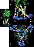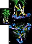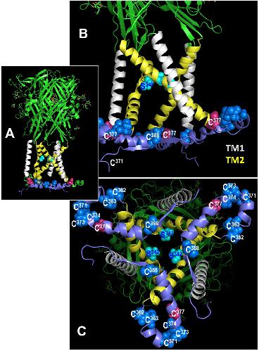 Figure 8. Location of cysteines C377 and C388 in the rat P2X7 receptor (rP2X7R) in the open channel conformation. In all figures, the C-terminal residues 400-595 to the end of the 595 residues long subunits are hidden for simplicity. (A) Side view of the large extracellular domain harboring the ATP binding sites, the six transmembrane domains (3 x TM1 in white, 3 x TM2, in yellow), and an interfacial helically structured domain lying parallel to the membrane plane. Also shown are the three S342 residues, which constitute the channel gate (46). (B) Enlarged side view of the transmembrane domains, the S342 residues (cyan) and the position of two (of three each) residues C377 and C388 in the interfacial region. The other blue spheres indicate additional cysteines of the cysteine-rich domain. (C) Perpendicular view from the cytoplasmic side on the numerous cysteine residues of the interfacial region and the transmembrane domains above.