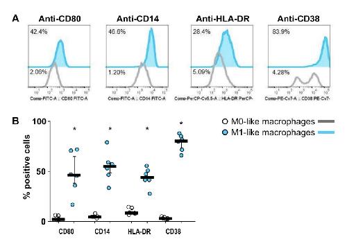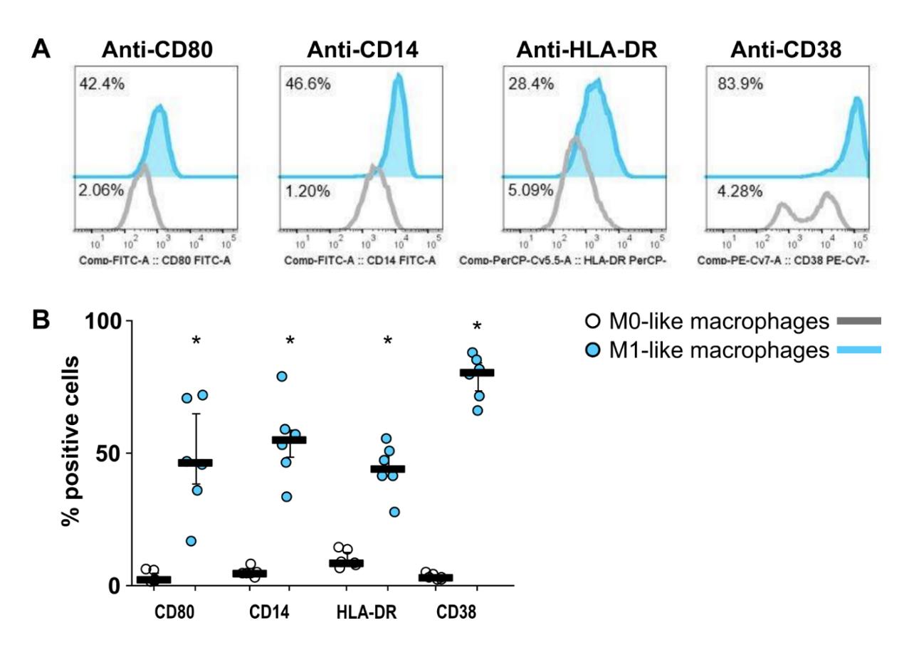 Supplementary Figure S2: Flow cytometry analyses confirmed that differentiated THP-1 cells expressed cell surface markers typical for M1-like macrophages. A) Representative histograms of CD80, CD14, HLA-DR and CD38 expression in M0- and M1-like THP-1 cell-derived macrophages. B) Quantification of macrophage subsets according to the cell surface marker expression in M0- and M1-like THP-1 cell-derived macrophages (n = 6). Data were analyzed by Kruskal-Wallis test followed by the Mann-Whitney rank sum test and presented as individual data points, bars represent median, whiskers percentiles 25 and 75. ∗ p ≤ 0.05 significantly different from corresponding M0-like macrophages.