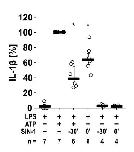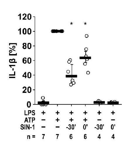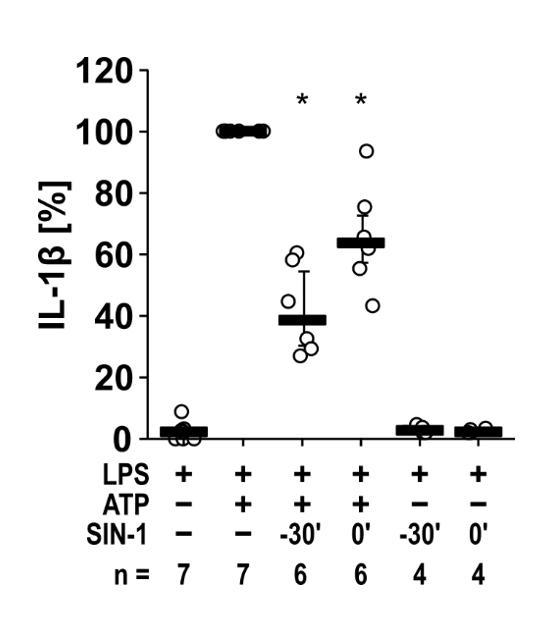 Supplementary Figure S4: The ATP-induced release of interleukin (IL)-1β by mouse peripheral blood mononuclear cells (PBMCs) is inhibited by the NO donor SIN-1. Freshly isolated mouse PBMCs from wild-type mice were left untreated or stimulated with ATP (1 mM) for 30 min, in the presence or absence of SIN-1. Addition of SIN-1 30 min before ATP (SIN-1 t = -30’) or shortly before ATP (SIN-1 t = 0’) inhibited the ATP-induced release of IL-1β. Data are presented as individual data points, bars represent median, whiskers percentiles 25 and 75. ∗ p ≤ 0.05 significantly different from samples in which ATP was given alone. Friedman test followed by the Wilcoxon signed-rank test.