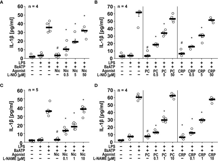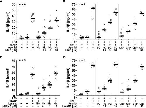 Figure 1 The inhibitory potential of nicotine (Nic), phosphocholine (PC) and C-reactive protein (CRP) on the BzATP-induced release of IL-1β by human monocytic U937 cells is prevented by nitric oxide synthase (NOS) inhibitors. U937 cells were primed with LPS (1 µg/ml) for 5 h, and BzATP (2’/3’-O-(4-benzoylbenzoyl)adenosine-5’-triphosphate, tri(triethylammonium) salt; 100 µM) was added for another 30 min to trigger IL-1β release, which was measured by ELISA. The inhibitory potential of the nicotinic acetylcholine receptor (nAChR) agonists Nic (100 µM), PC (100 µM) and CRP (5 µg/ml) on the BzATP-induced release of IL-1β was investigated in absence and presence of the NOS inhibitors (A, B) L-NIO (N5-(1-iminoethyl)-L-ornithine dihydrochloride) and (C, D) L-NAME (N-omega-nitro-L-arginine methyl ester hydrochloride). The inhibitory potential of nAChR agonists on the BzATP-induced release was concentration-dependently prevented by all NOS inhibitors. (A, C) Some IL-1β values (untreated, LPS, LPS+BzATP, LPS+BzATP+Nic) served as controls for multiple NOS inhibitors (Supplementary Figures S1A, C). Data are presented as individual data points, bars represent median, whiskers percentiles 25 and 75. # p ≤ 0.05 significantly different from samples, in which BzATP was given alone, *p ≤ 0.05 significantly different from BzATP + nicotine. Kruskal-Wallis followed by Mann-Whitney rank sum test.
