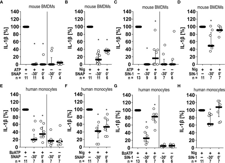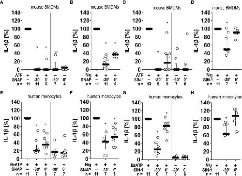Figure 5 Inhibition of IL-1β release by the NO donors SNAP and SIN-1 in murine bone marrow-derived macrophages (BMDMs) and primary human monocytes. (A–D) Mouse BMDMs were primed with lipopolysaccharide (LPS; 1 µg/ml, 5 h). (A, C) Thereafter, ATP (1 mM) was added for another 40 min to trigger IL-1β release, which was measured by ELISA. Application of the NO donor SNAP (S-nitroso-N-acetyl-DL-penicillamine; 1 mM) 30 min prior to ATP (t = -30´) or shortly before ATP (t = 0´) reversed the ATP-induced release of IL-1β. Similar results were found by using SIN-1 (1 mM). (B, D) To test for P2X7 receptor-independent IL-1β release, nigericin (Nig; 50 µM) was added together with apyrase (0.5 U/ml) for 40 min to LPS-primed mouse BMDMs. The Nig-induced IL-1β release was unimpaired by SIN-1 at t = 0´ and slightly reversed in presence of SNAP and SIN-1 at t = -30´. The amount of IL-1β released in response to ATP/Nig was calculated by subtracting the IL-1β concentrations measured in supernatants of cells treated with LPS alone. ∗ p ≤ 0.05 significantly different from samples, in which ATP or Nig was given alone. (E–H) Similar experiments were performed on primary human monocytes enriched from freshly collected human whole blood. Cells were primed with LPS (5 ng/ml, 20 min pulse) during the enrichment process. After 3 h, BzATP ((2’/3’-O-(4-benzoylbenzoyl)adenosine-5’-triphosphate, tri(triethylammonium) salt; 100 µM); (E, G) or Nig (F, H) was added for another 30 min to trigger IL-1β release. The IL-1β concentration in experiments, in which primed cells were stimulated with BzATP or Nig alone, was set to 100% and all other values were calculated accordingly. ∗ p ≤ 0.05 significantly different from samples, in which BzATP was given alone. (A–H) Data are presented as individual data points, bars represent median, whiskers percentiles 25 and 75. Friedman test followed by the Wilcoxon signed-rank test.