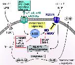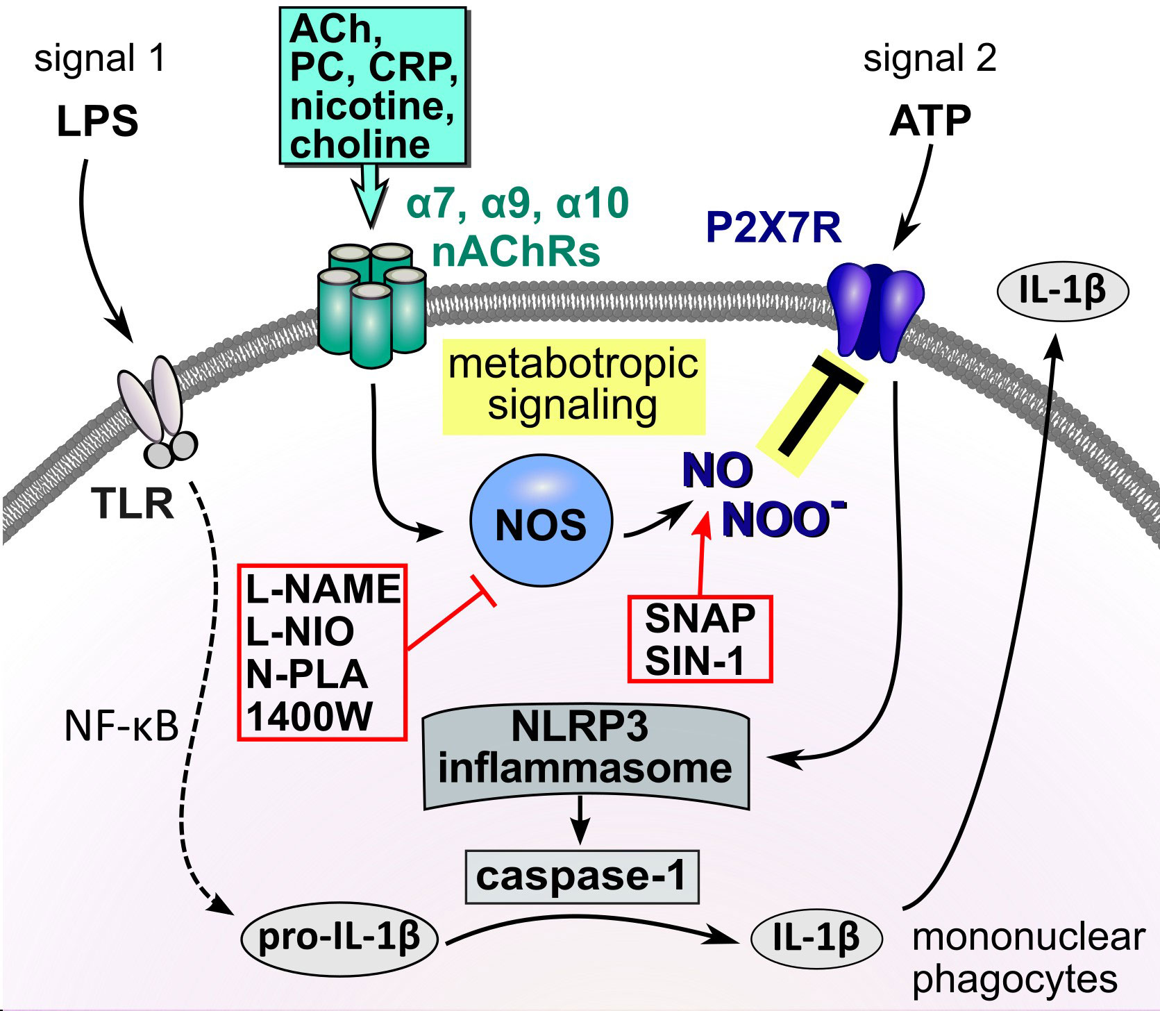 Figure 9 Schematic summary of the proposed metabotropic signaling mechanism. In mononuclear phagocytes extracellular ATP originating from activated cells or spilled cytoplasm of damaged cells trigger the ionotropic function of the P2X7R, resulting in NLRP3 inflammasome assembly, activation of caspase-1, cleavage of pro-IL-1β and release of bioactive IL-1β. Activation of nAChRs by classical and unconventional agonists down-regulates the response of the ATP-sensitive P2X7R, impairs NLRP3 inflammasome assembly and, consequently, the maturation as well as the release of IL-1β. We provide evidence that this inhibitory effect of nAChR stimulation on the secretion of IL-1β is mediated via endothelial NOS and modification of the P2X7R. ACh, acetylcholine; ATP, adenosine triphosphate; CRP, C-reactive protein; DAMP, danger-associated molecular pattern; IL-1β, interleukin-1β; LPS, lipopolysaccharide; nAChRs, nicotinic acetylcholine receptors; NF-κB, nuclear factor κB; NLRP3, NACHT, LRR, and PYD domains-containing protein 3; NOS, NO synthase; P2X7R, P2X7 receptor; PAMP, pathogen-associated molecular pattern; PC, phosphocholine; SNAP, S-nitroso-N-acetyl-DL-penicillamine; TLR, Toll-like receptors.