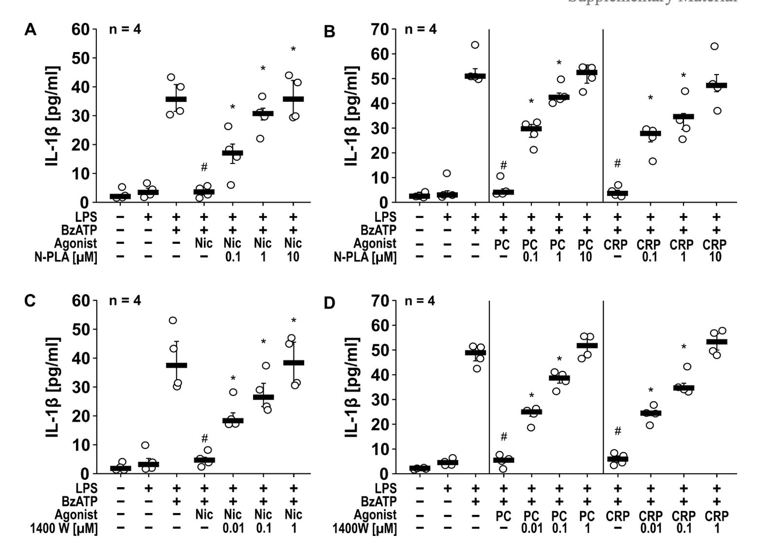 Supplementary Figure S1: The inhibitory potential of nicotine (Nic), phosphocholine (PC) and C-reactive protein (CRP) on the BzATP-induced release of interleukin-1β (IL-1β) by human monocytic U937 cells is reversed by nitric oxide synthase (NOS) inhibitors. U937 cells were primed with LPS (1 µg/ml) for 5 h, and BzATP (2’/3’-O-(4-benzoylbenzoyl)adenosine-5’-triphosphate, tri(triethylammonium) salt; 100 µM) was added for another 30 min to trigger IL-1β release, which was measured by ELISA. The inhibitory potential of the nicotinic acetylcholine receptor (nAChR) agonists Nic (100 µM), PC (100 µM) and CRP (5 µg/ml) on the BzATP-induced release of IL-1β was investigated in absence and presence of a panel of NOS inhibitors: A, B) N-PLA (N-omega-allyl-L-arginine hydrochloride) and C, D) 1400 W (1400 W dihydrochloride). The inhibitory potential of nAChR agonists on the BzATP-induced release was concentration-dependently reversed by all NOS inhibitors. Some IL-1β values (untreated, LPS, LPS+BzATP, LPS+BzATP+Nic) served as controls for multiple NOS inhibitors (Figure 1A, C). Data are presented as individual data points, bars represent median, whiskers percentiles 25 and 75. # p ≤ 0.05 significantly different from samples, in which BzATP was given alone, * p ≤ 0.05 significantly different from BzATP + nicotine. Kruskal-Wallis followed by Mann-Whitney rank sum test.