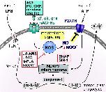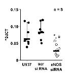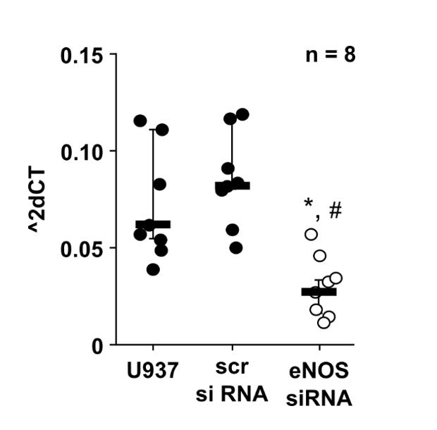 Supplementary Figure S3: Reduction of mRNA expression of endothelial nitic oxide synthase (eNOS, NOS3) upon siRNA transfection. U937 cells were left untreated (U937) or transfected with control siRNA or with siRNA specifically targeting eNOS (NOS3). Forty-eight hours after transfection, the mRNA expression of eNOS was analyzed by real-time RT-PCR. Transfection with gene-specific siRNA efficiently down-regulated the mRNA expression of NOS3. Data were analyzed by Kruskal-Wallis test followed by the Mann-Whitney rank sum test and presented as individual data points, bars represent median, whiskers percentiles 25 and 75. ∗ p ≤ 0.05 significantly different from samples transfected with control siRNA. # p ≤ 0.05 significantly different from untreated samples.