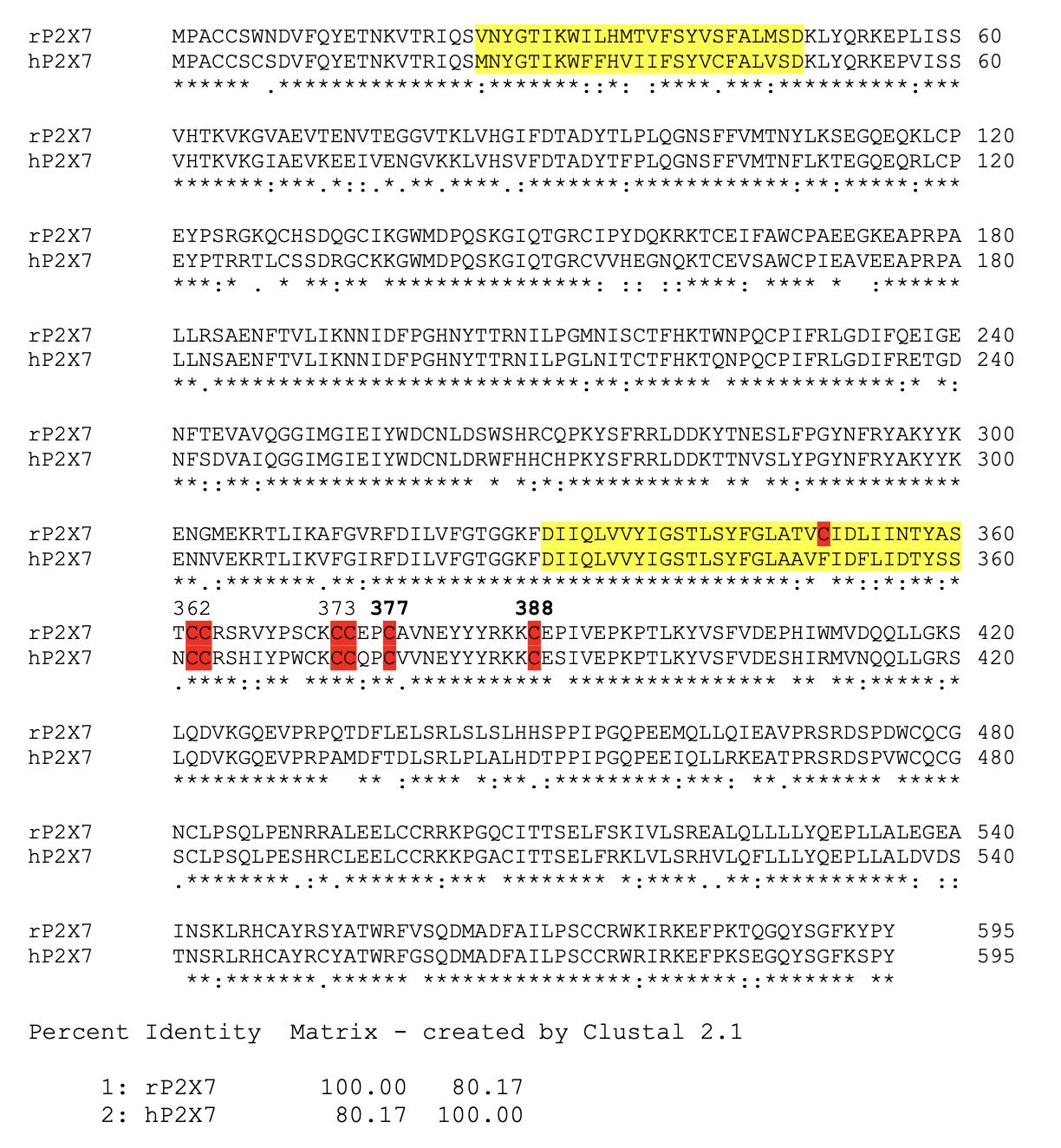 Supplementary Figure S6: Sequence Alignment of the rat (rP2X7) and human (hP2X7) P2X7 receptor. Sequence alignment using Clustal Omega software (https://www.ebi.ac.uk/Tools/msa/clustalo/; DOI: 10.1093/nar/gkac240) revealed 80.17 % sequence identity. Two highly conserved regions are marked (yellow). The highlighted region in red denotes the conserved active site residues of cysteine C377 and C388
