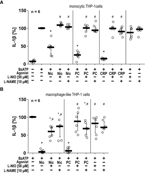 Figure 2 The inhibitory potential of nicotine (Nic), phosphocholine (PC) and C-reactive protein (CRP) on the BzATP-induced release of IL-1β by human monocytic and macrophage-like THP-1 cells is reversed by nitric oxide synthase (NOS) inhibitors. Monocytic (A) and differentiated macrophage-like (B) THP-1 cells were used. Cells were primed with lipopolysaccharide (LPS; 1 µg/ml, 5 h). Thereafter, the P2X7 receptor agonist BzATP ((2’/3’-O-(4-benzoylbenzoyl)adenosine-5’-triphosphate, tri(triethylammonium) salt) was added for another 40 min to trigger IL-1β release, which was measured by ELISA. The inhibitory potential of Nic (100 µM), PC (200 µM) and CRP (10 µg/ml) on the BzATP-induced release of IL-1β was investigated in absence and presence of the NOS inhibitors L-NIO (50 µM; N5-(1-iminoethyl)-L-ornithine dihydrochloride) or L-NAME (10 µM; N-omega-nitro-L-arginine methyl ester hydrochloride). (B) In experiments on macrophage-like THP-1 cells, the concentration of IL-1β released in response to BzATP was calculated by subtracting the IL-1β concentrations measured in supernatants of cells treated with LPS alone. In each experiment, the IL-1β concentration obtained after stimulation with BzATP was set to 100% and all other values were calculated accordingly. Data are presented as individual data points, bars represent median, whiskers encompass the 25th to 75th percentile. *p ≤ 0.05, different from LPS-primed cells stimulated with BzATP alone; #p ≤ 0.05 significantly different from samples, in which BzATP plus agonist was given. Friedman test followed by the Wilcoxon signed-rank test.