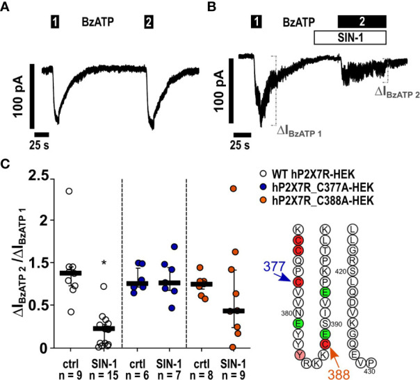 Figure 7. The NO and peroxynitrite donor SIN-1 inhibits the BzATP-induced ion channel functions in human P2X7 receptor (hP2X7R) expressing HEK cells via the cysteine C377 in the C-terminal intracellular loop. (A, B) Depicted are representative current curves of whole-cell patch-clamp measurements. (A, C) In control experiments (ctrl) on human wild-type (WT) P2X7R expressing HEK cells (WT hP2X7-HEK), consecutive application of the P2X7R agonist BzATP (100 µM) induced repetitive ion current stimulations (BzATP1 and 2). (B, C) In the presence of SIN-1 (1 mM), the BzATP-induced ion current was blunted. (C) Similar experiments were performed on HEK cells expressing hP2X7R mutants generated by replacing cysteine 377 or 388 by an alanine (hP2X7_C377A; hP2X7_C388A) in the C-terminal intracellular loop. The BzATP-induced current changes (ΔIBzATP1, ΔIBzATP2) were normalized (ΔIBzATP2/ΔIBzATP1). (C) All BzATP-induced current changes (ΔIBzATP) are shown as individual data points, bars represent median, whiskers encompass the 25th to 75th percentile. *p ≤ 0.05, Friedman test followed by the Wilcoxon signed-rank test.