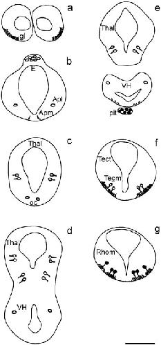 Figure 1. Diagrams of coronal sections from rostral to caudal (a–g) through the brain of a Xenopus laevis larva at stage 37/38, showing darkly (solid) and lightly (open) stained cell bodies and fibers. Some neuron groups cannot be designated because of the early developmental stage. For abbreviations , see list. Scale bar = 100 μm.