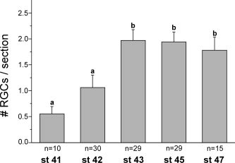 Figure 7. Numbers of α-MSH-immunoreactive profiles of retinal ganglion cell bodies per section per eye in Xenopus larvae at stages 41–47. Values are expressed as means ± SEM. Bars with different superscripts differ significantly (P < 0.05).