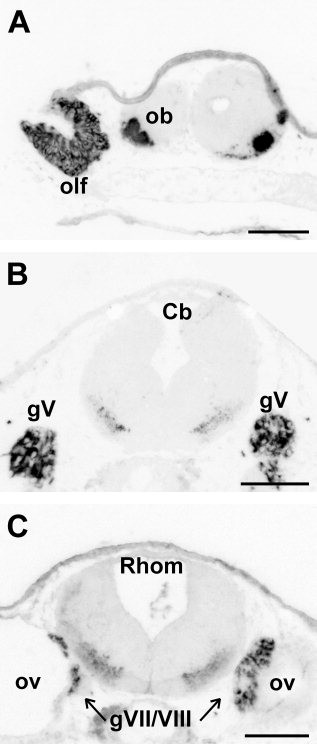 Figure 5. Coronal sections of Xenopus larvae at stages 43 (A,C) and 45 (B). Immunoreactivity is present in the olfactory epithelium (olf; A), the ganglion of the Vth cranial nerve (gV; B) and the fused ganglion of the VIIth and VIIIth cranial nerves (gVII/VIII; C). For other abbreviations , see list. Scale bar = 50 μm.