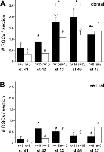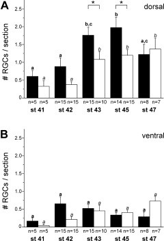 Figure 8. Numbers of α-MSH-immunoreactive profiles of retinal ganglion cell bodies per section per eye in the dorsal (A) and ventral (B) halves of the retina of black (solid bars)- and white (open bars)-adapted Xenopus larvae at stages 41–47. Values are expressed as means ± SEM. Bars of one color with different superscripts differ significantly (P < 0.05). Asterisks indicate a significant difference between black- and white-adapted animals (P < 0.05).