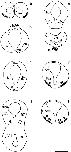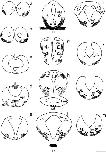 Figure 3. Diagrams of coronal sections from rostral to caudal (a–m) through the brain of a Xenopus larva at stage 45, showing darkly (solid) and lightly (open) stained cell bodies and fibers (lines and small dots). For abbreviations , see list. Scale bar = 100 μm.