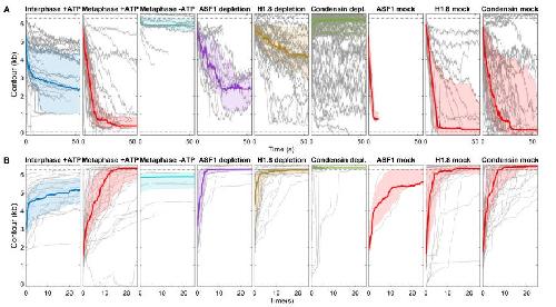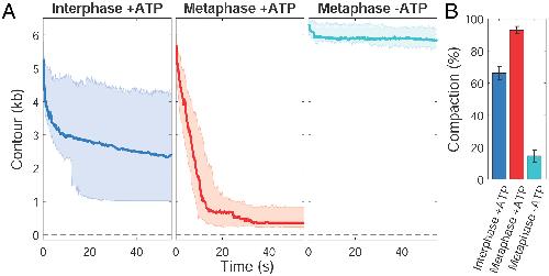Fig.2. Cell cycle–dependent DNA compaction requires ATP. (A) DNA extension in base pairs over time following release from high force in interphase-arrested HSE with added ATP (blue), metaphase-arrested HSE with added ATP (red), and metaphase-arrested HSE without added ATP and treated with apyrase to degrade ATP (cyan). The thick line in each plot is the median trace and the bands indicate the upper and lower quartiles. Data are displayed at 5 Hz. Full-length (6,256 bp) and zero-length DNA contours are indicated with gray dashed lines. (B) Degree of compaction in each of the conditions in panel A. Individual traces are shown in SI Appendix, Fig. S3.