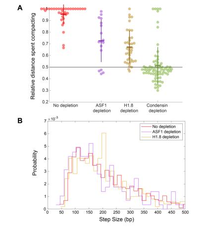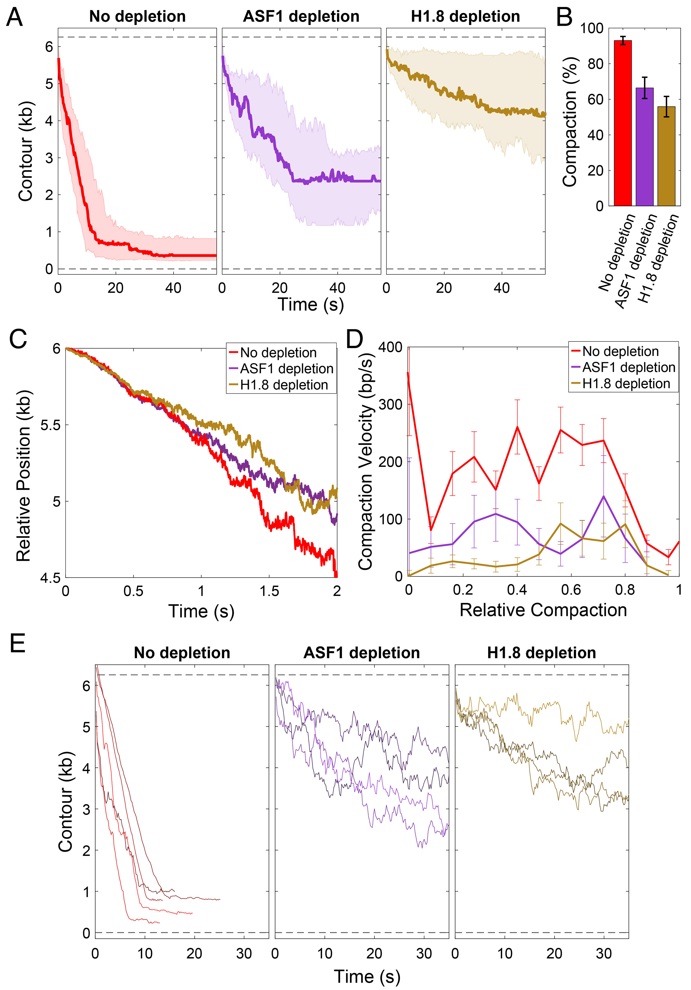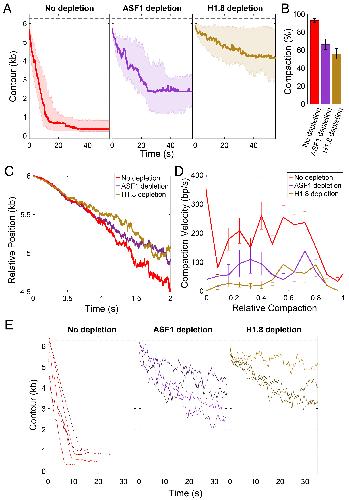 Fig.3. Core and linker histones contribute to single DNA compaction. (A) Compaction time course profiles upon no depletion (red), ASF1 depletion (purple), or linker histone H1.8 depletion (brown). The thick line in each plot is the median trace and the bands indicate the upper and lower quartiles. Data are displayed at 5 Hz. (B) Relative effects of ASF1 and H1.8 depletion on final compaction level. (C) Compaction dynamics in control and histone-depleted reactions. Curves show median trace of actively compacting fibers (SI Appendix). Fibers under depletion conditions condense more slowly after 1 s, indicating slippage. (D) Compaction velocities (mean ± SEM) as a function of relative compaction state. Rates of overall compaction are higher in control reactions, but do not vary significantly with the relative level of compaction in control or following core or linker histone depletion. SI Appendix, Fig. S3 (E) A subset of traces is shown to illustrate that more frequent upward movements are observed upon depletion of ASF1 or H1.8. See SI Appendix, Fig. S4B for quantification. Individual traces under each condition are shown in SI Appendix, Fig. S3.