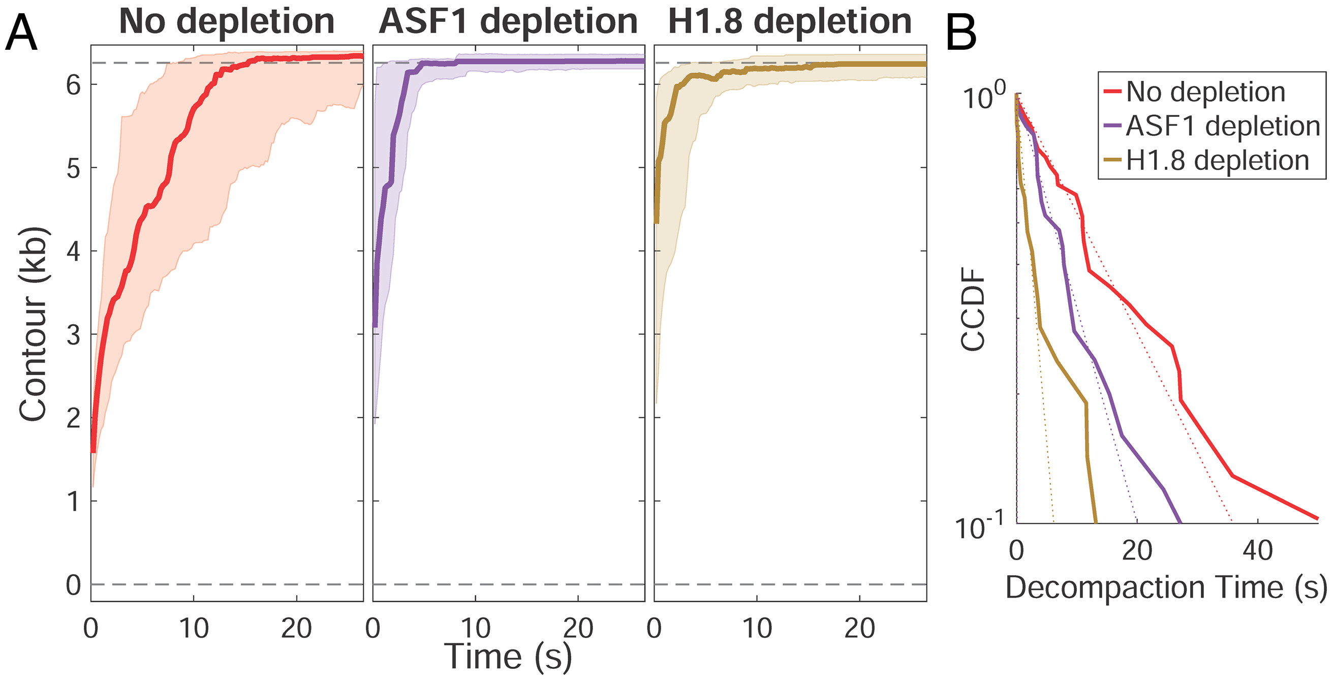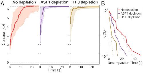 Fig.4. Core and linker histones contribute to the compacted state of the DNA fiber. (A) Decompaction time course profiles at high force in HSE with no depletion (red), ASF1 depletion (purple), or linker H1.8 depletion (brown). The thick line in each plot is the median trace and the bands indicate the upper and lower quartiles. Data are displayed at 5 Hz. (B) Complementary cumulative distribution function (CCDF) fitting to decompaction times show the extent to which ASF1 and H1.8 depletions reduce decompaction time. Individual traces for each condition are shown in SI Appendix, Fig. S3.