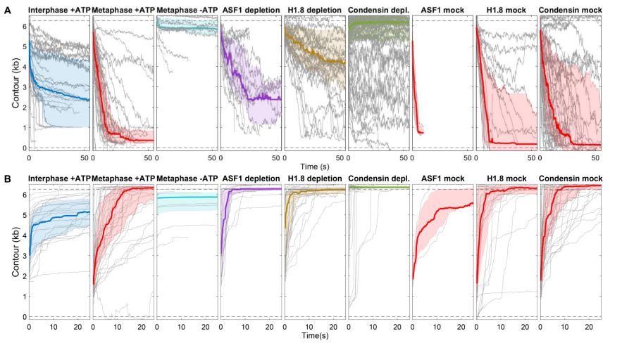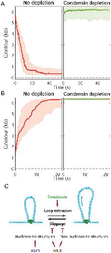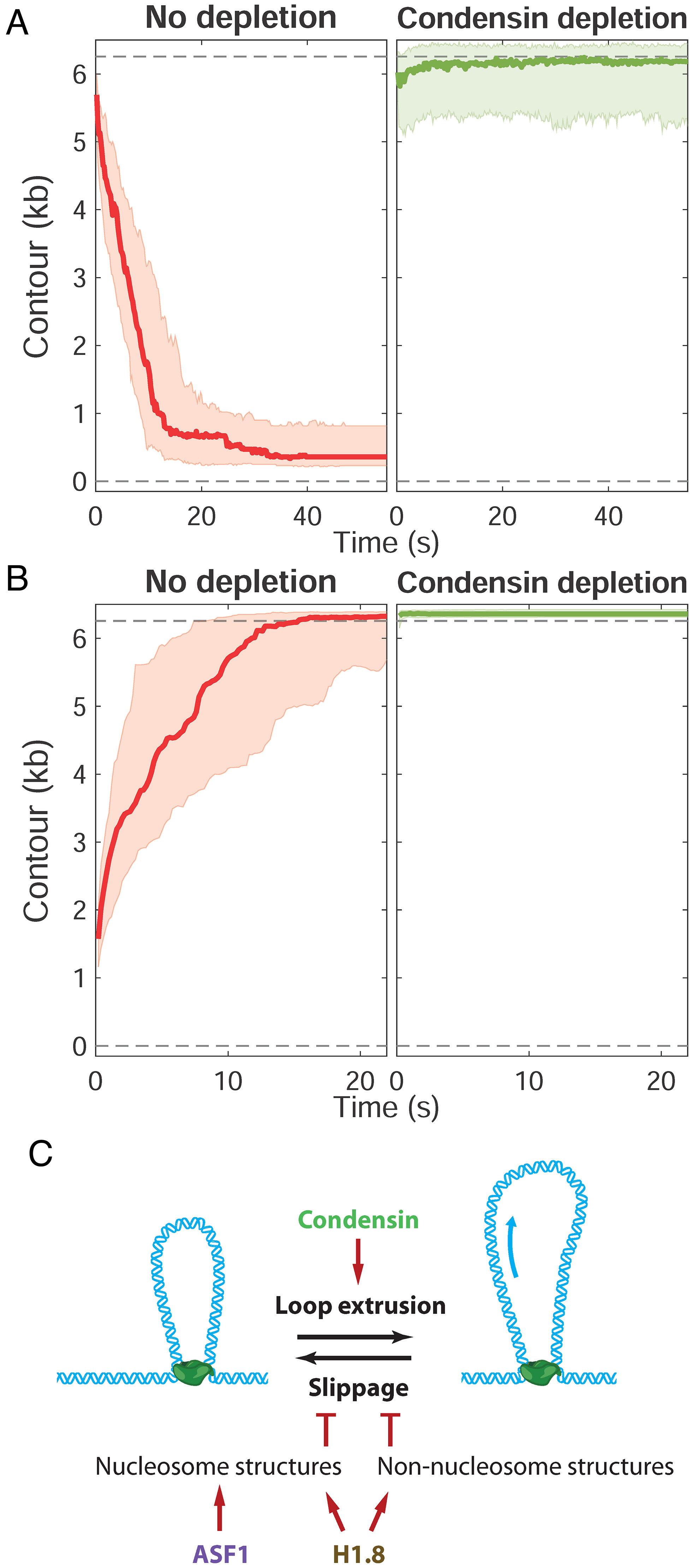 Fig.5. Effects of condensin depletion on compaction and decompaction dynamics. Time course profiles for compaction at low force (A) and decompaction at high force (B) in HSE with no depletion (red) and condensin depletion (green). The thick line in each plot is the median trace and the bands indicate the upper and lower quartiles. Data are displayed at 5 Hz. (C) Model in which condensin-extruded DNA loops are stabilized by formation of nucleosomes as well as nonnucleosomal H1.8-DNA interactions that inhibit condensin slippage.