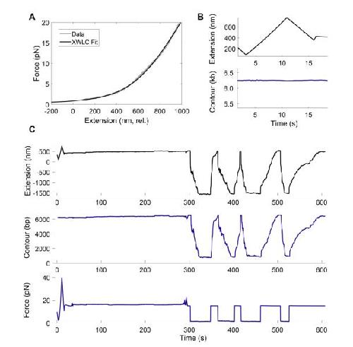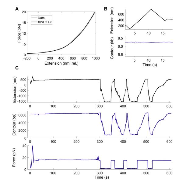 DNA tether in gray, and an Extensible Worm Like Chain (XWLC) fit in black. (B) The contour