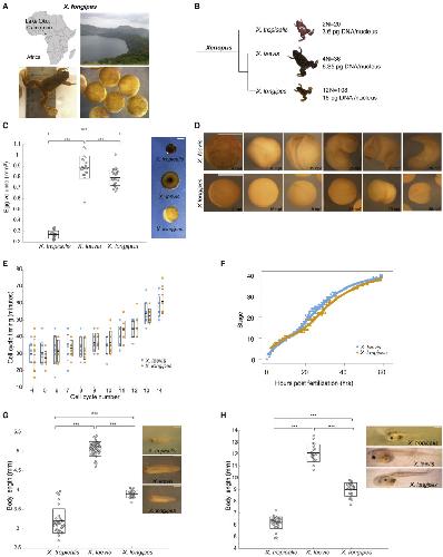(A) Map28 and photograph19 of Lake Oku in Cameroon, Africa, and images of X. longipes frog and blastula stage embryos. Scale bars, 1 mm.