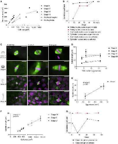 (E) Average egg spindle length (stage 1, meiotic) plotted as a function of egg volume. See Figure S4C for distribution.