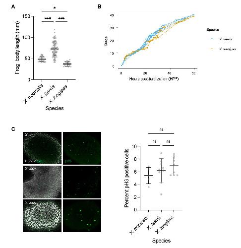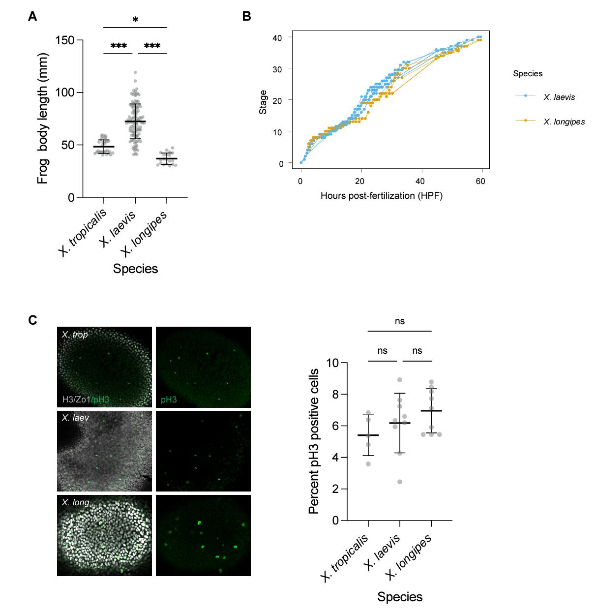 Figure S1. X. longipes body length and further development characterization. Related to Figure 1 (A) Snout to vent length plotted for male and female adult X. tropicalis, X. laevis, and X. longipes frogs. n=21 X. longipes measured. Lengths of X. tropicalis (n=38) and X. laevis (n=110) are from S1 . *p<0.05, ***p<0.001, determined by two-tailed t-test. (B) Developmental time course in X. longipes vs X. laevis, without smoothened line, showing individual timepoints. (C) Immunofluorescence staining of stage 21 X. tropicalis, X. laevis, and X. longipes embryos to assess the fraction of mitotic cells in each species. Cell borders (stained for tight junction marker ZO-1) and nuclei (stained for histone H3) are shown in gray. Dividing cells are stained with M-phase marker phospho-H3 (pH3). Quantification shows percent of pH3- positive cells in each species. Thick line in the middle of each set of points = mean, error bars= +/- std dev. ns= not significant p>0.05, determined by twotailed t-test.