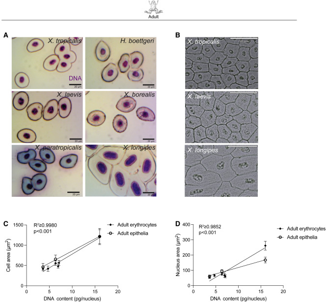 (C) Average cell cross-sectional area in adult erythrocytes and epithelia as a function of genome size for each frog species. Five pipid frog species are plotted for erythrocytes; X. tropicalis, X. laevis, and X. longipes are plotted for epithelial cells. R2 ≥ 0.9980 for both erythrocytes and epithelia. See Figures S2B and S2C for distributions and Figure S3C for correlation and slope coefficients of each trend line.