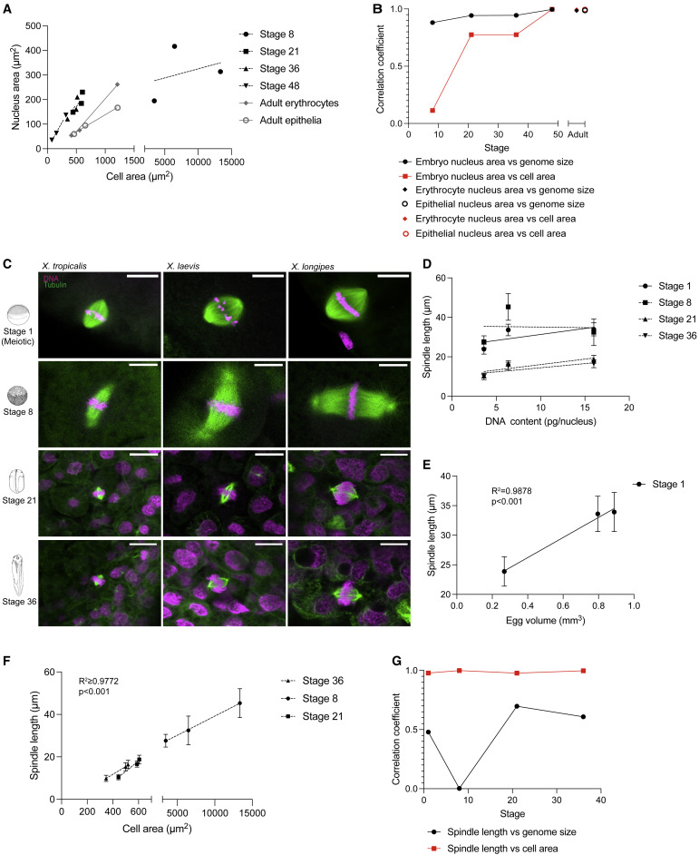 (F) To test the relationship between genome and nuclear size during development across species, we plotted average nucleus cross-sectional area in embryos and adults as a function of genome size in X. tropicalis, X. laevis, and X. longipes to generate regression lines. See Figure S3E for distributions and Figure S3F for correlation and slope coefficients of each trend line.