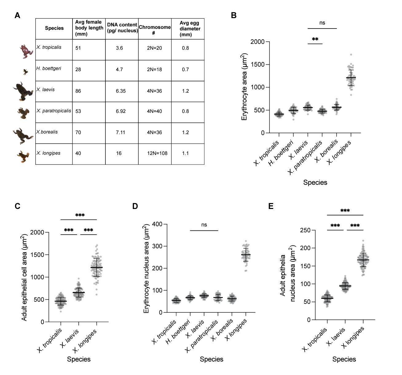 Figure S2. Measurements of cells and nuclei in adult Pipid frog species. Related to Figure 2 (A)Characteristics of frog species used for erythrocyte measurements. (B)Cross-sectional cell area of erythrocytes from adult frog species described in S1A. All P-values between species are <0.001 (not shown), except where indicated as not significant (p>0.05, ns) or (p<0.005,**) determined by two-tailed t-test. (C)Cross-sectional cell area of epithelial cells from adult X. tropicalis, X. longipes, and X.laevis. (D)Cross-sectional nucleus area of erythrocytes from adult frog species described in S1A. All p-values between species are <0.001 (not shown), except where indicated as not significant (ns) determined by two-tailed t-test. (E)Cross-sectional nucleus area of epithelial cells from adult X. tropicalis, X. longipes, and X. laevis. For plots in B-E, thick line in the middle of each set of points = mean, error bars = +/- std dev. ***p<0.001. For erythrocytes, n≥50 cells and nuclei were measured in each species. For epithelia, n≥100 cells and nuclei were measured in each species.