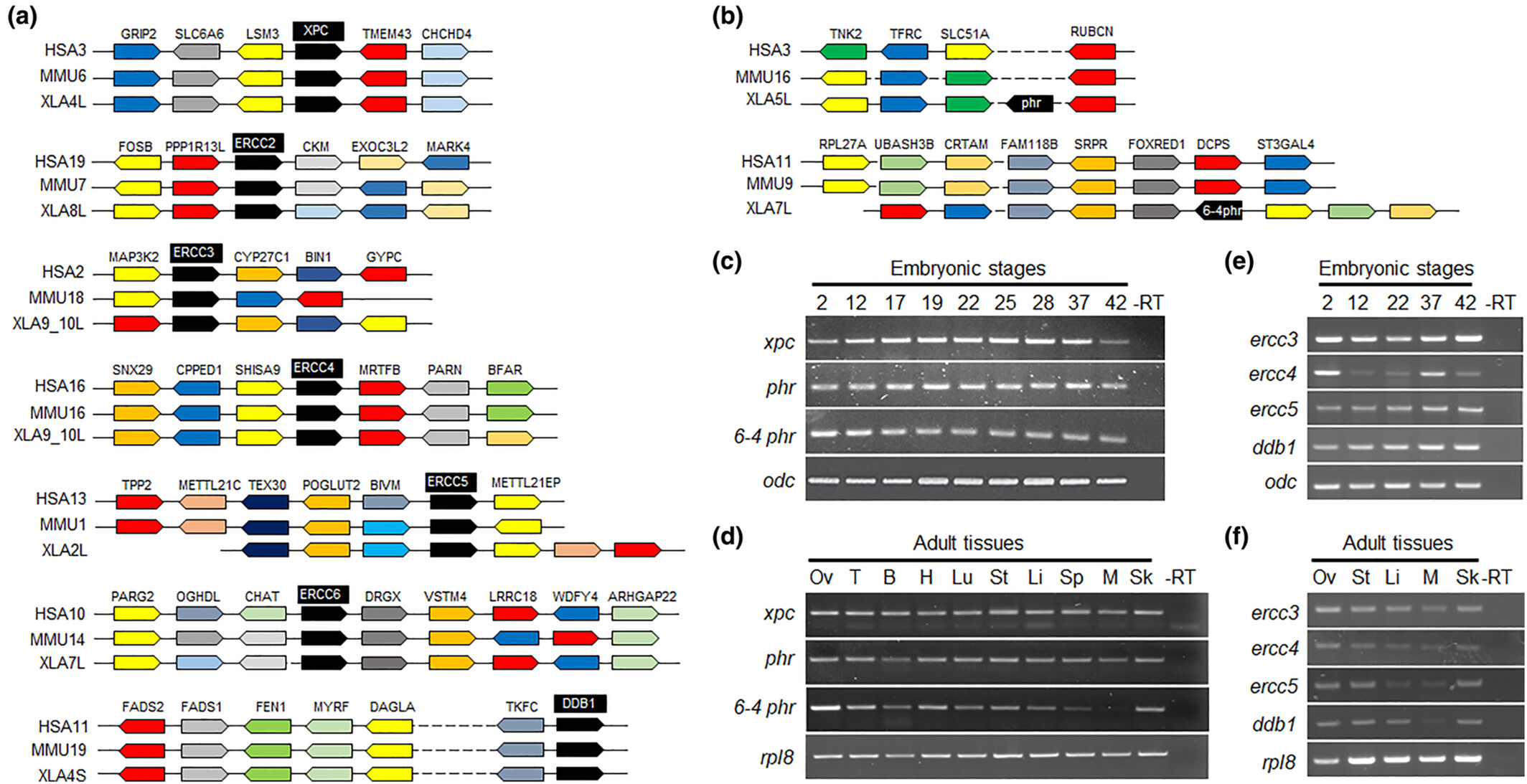 FIGURE 1. Gene expression pattern of NER proteins, CPD photolyase (phr), and 6–4PP photolyase (6–4phr) in Xenopus laevis. (a) Conserved syntenic regions between human (Hsa), mouse (Mmu), and Xenopus laevis (Xl) chromosome regions containing xpc, ercc2 to ercc6 and ddb1 loci. (b) Comparison of syntenic regions around Xenopus phr and 6–4 phr genes showing the absence of the genes in the mammalian genomes. The chromosome number for each species is indicated. Boxes with the same color correspond to ortholog genes. The versions of the genomes used to establish are as follows: Human, GRCH38; p7; mouse, GRCm38; Xenopus laevis version 9.1; the drawing is not on scale to avoid complexity. (c–d) RT–PCR analysis of RNA expression of xpc, phr, and 6–4phr in embryos at stage 2 to stage 42 (c) and in adult tissues (d). (e–f) RT–PCR analysis of RNA expression of ercc3 to 5 and ddb1 in embryos at stage 2 to stage 42 (e) and in adult tissues (f). Br, brain; H, heart; Li, liver; Lu, lung; M, skeletal muscle; Ov, ovary; Sk, skin; Sp, spleen; St, stomach; T, testis. Odc and rpl8 gene expression was used as control. -RT, control without reverse transcription.