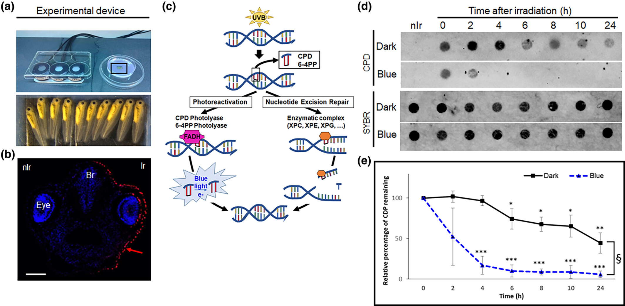 FIGURE 2. Removal kinetics of CPDs from genome following exposure of Xenopus embryos to UVB irradiation and blue light. (a) UVB irradiation device. Embryos were placed on agarose dish (upper panel) and exposed to UVB on their left side (lower panel). (b) Immunostaining analysis of a histological section at the level of the head of a stage 42 irradiated embryo. CPDs (red arrow) are found on the irradiated side (Ir) but absent from the non-irradiated side (nIr). Br, brain; Scale bar is 150 μm. The nuclei were stained with DAPI (blue color). (c) Photoreactivation and NER systems cooperate together in Xenopus embryos to remove UVB-induced DNA damage. Following their activation with blue light, photolyases break up directly pyrimidine dimers. The NER system is a multistep process, in which several proteins are involved in recognition of DNA damage, excision of the lesion and surrounding nucleotides and finally filling the gap by de novo DNA synthesis. (d) CPD quantities (DNA repair capacity) were assessed on embryos genomic DNA by immune dot blot analysis at indicated time points after irradiation. Embryos were kept after irradiation either in dark (Dark) or under blue light (Blue). SYBR green was used as loading control. (e) Quantification of the dot bot results showed in d. n = 4 per condition, *p < 0.05, **p < 0.01, and ***p < 0.0005 for irradiated embryos at the indicated time points versus the initial levels. §p < 0.01 for embryos kept in dark versus embryos exposed to blue light.